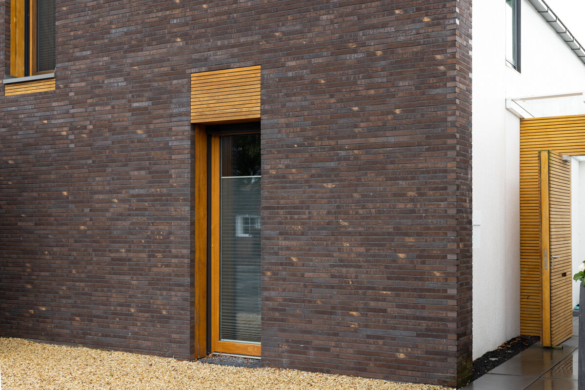 Vor der Wahl des konkreten Steins stand auch beim Einfamilienhaus H1 mit Klinker 117-119-ModF braun - blau nuanciert die Entscheidung, ob man die Fassade ganz klassisch mit einem Klinker verblendet oder ob man evtl. auf ein Klinker-Riemchen zurückgreift. Während Klinker bei Neubauten für eine Klinkerfassade zwar weiterhin am häufigsten gewählt werden, nimmt die Anzahl an Bauherren, die sich für Riemchen-Klinker entscheiden, stetig zu: Im Unterschied zum normalen Klinker sind Riemchen nur 10 bis 20mm stark und werden auf direkt auf die Fassade geklebt.