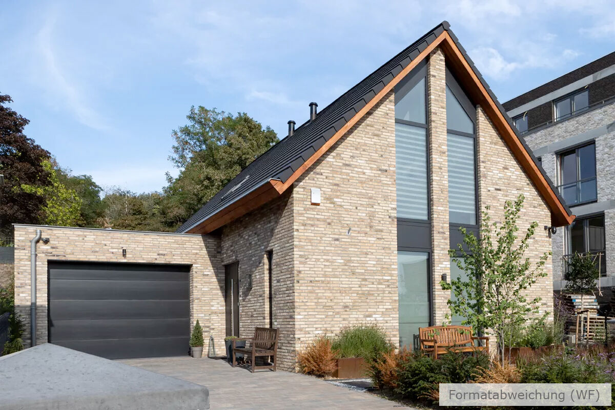 Die hier abgebildete Immobilie ist ein Einfamilienhaus 103-183-WDF-H10, dessen Fassade mit dem Handform-Klinker BK-103-183-WDF (Waaldickformat-Klinkerstein (WDF)) beige - braun nuanciert gestaltet wurde. Die verwendeten Klinker haben ein Waaldickformat (WDF) mit Abmessungen von 210 x 100 x 65 mm (LxBxH) und werden aus gebrannter Ton hergestellt. Die Produktion der Klinker für das Einfamilienhaus erfolgt im Handform-Verfahren. Für die Klinkerfassade des Einfamilienhauses 103-183-WDF-H10 werden pro Quadratmeter Fassadenfläche 58 Klinkersteine verwendet, den dort verwendeten Klinker finden Sie hier: Zum Handform-Klinker BK-103-183-WDF (Waaldickformat-Klinkerstein (WDF)) beige - braun nuanciert