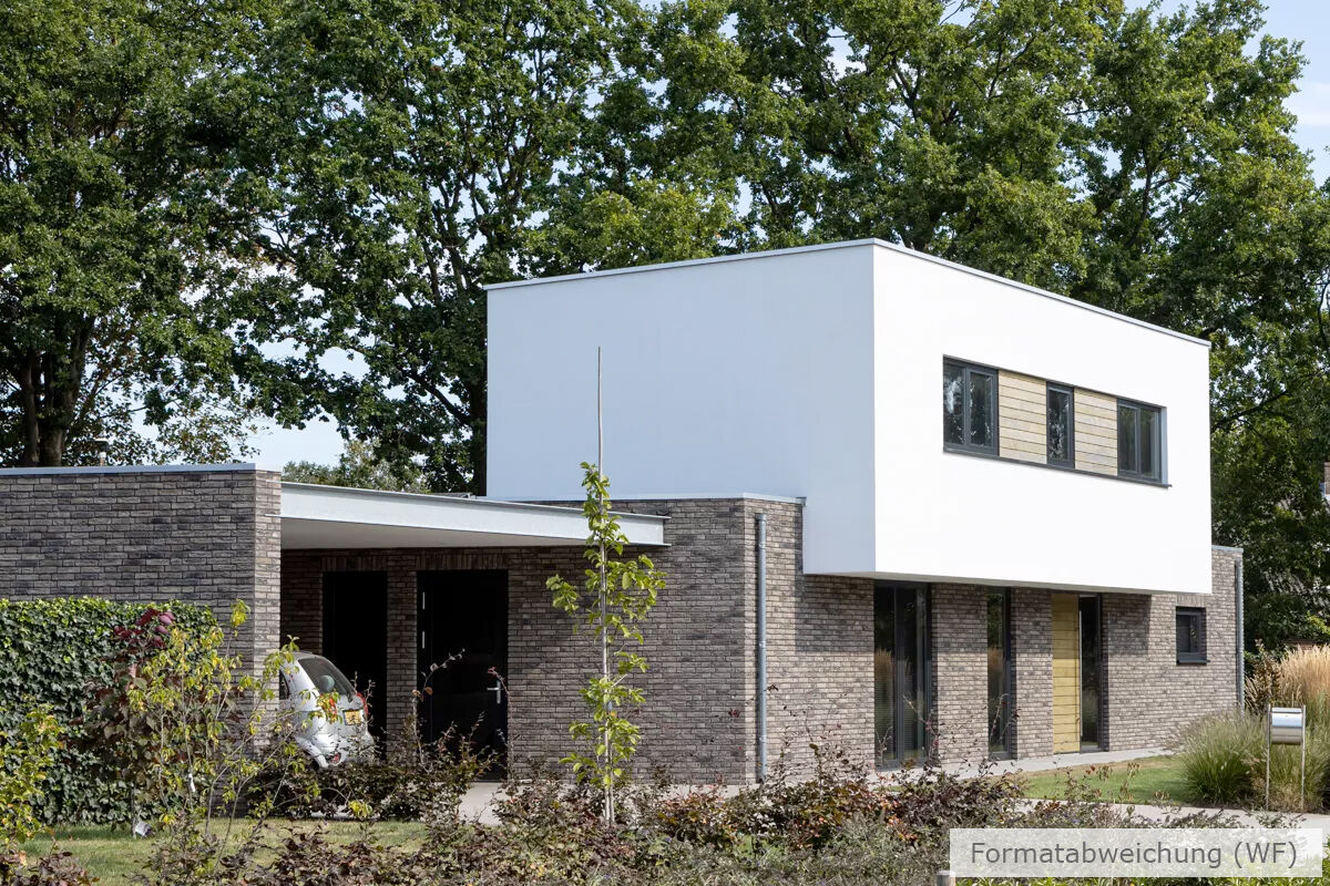 Für das hier präsentierte moderne Luxushaus 103-112-WDF-H26 haben sich die Bauherren für eine Variante im Waaldickformat (WDF) entschieden, so dass die Klinker Maße von 210 x 100 x 65 mm (LxBxH) haben. In Kombination mit dem Handform-Verfahren und der Farbe grau-bunt entsteht dann für das Luxushaus eine ganz eigene Anmutung der Klinkerfassade, die die Architektur unterstützt und Akzente setzt.