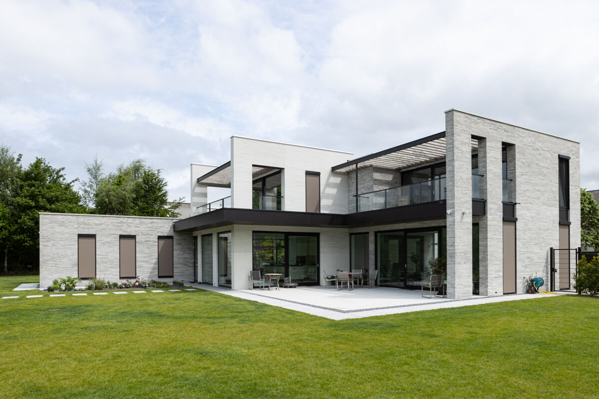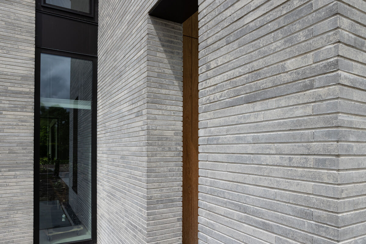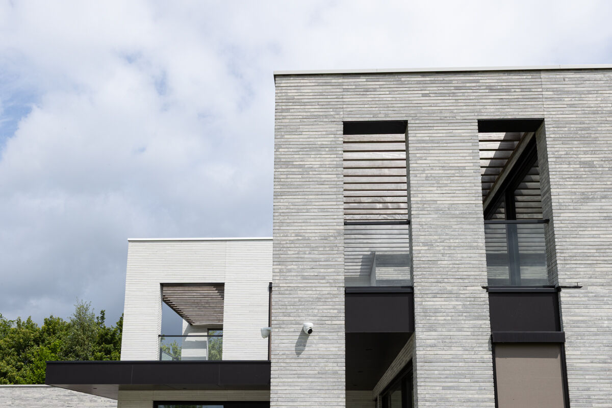 Für das hier präsentierte moderne Luxushaus 118-114-ModF-H5 haben sich die Bauherren für eine Variante im Modulformat (ModF) entschieden, so dass die Klinker Maße von 595 x 95 x 40 mm (LxBxH) haben. In Kombination mit dem Strangpress-Verfahren und der Farbe grau nuanciert entsteht dann für das Luxushaus eine ganz eigene Anmutung der Klinkerfassade, die die Architektur unterstützt und Akzente setzt.