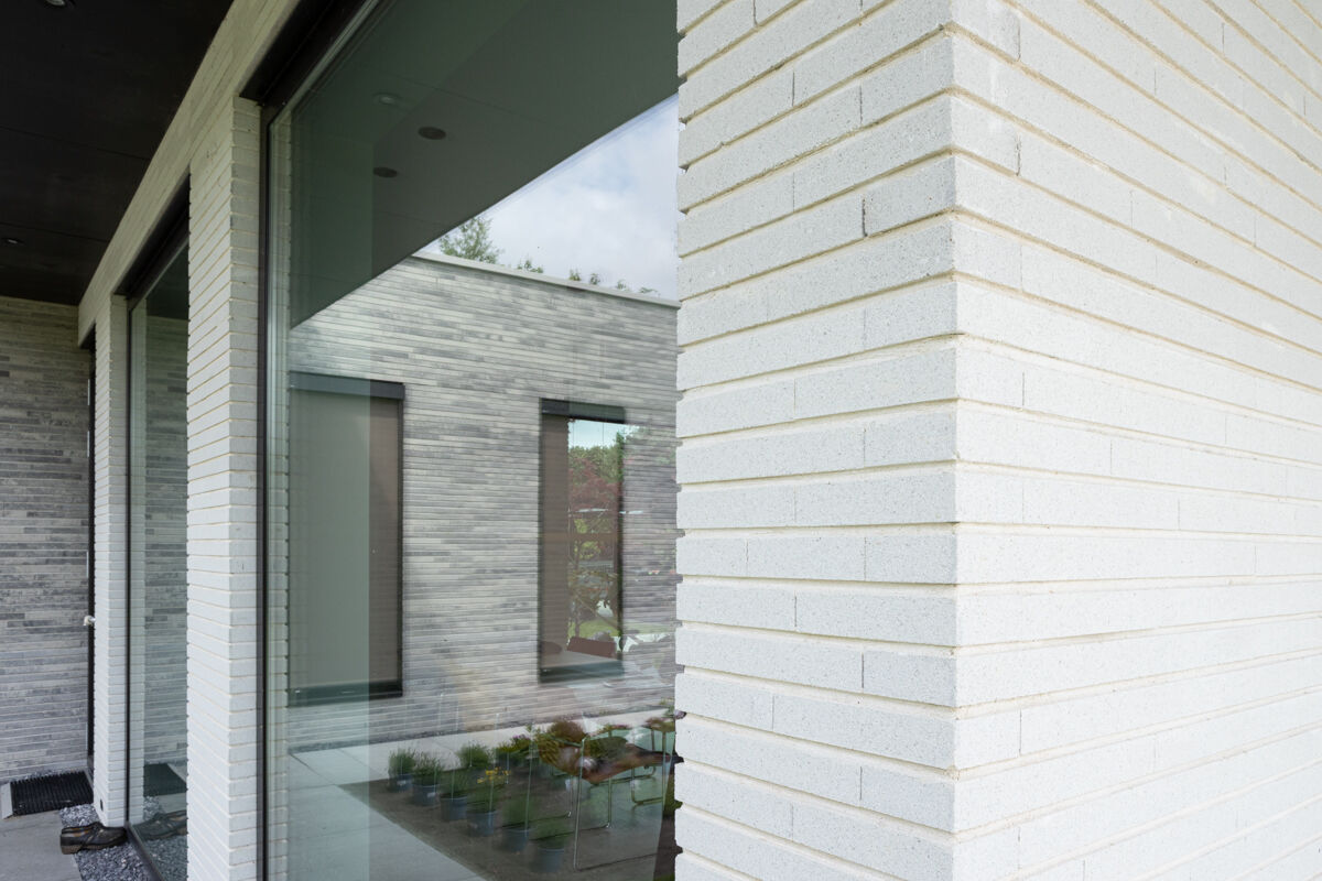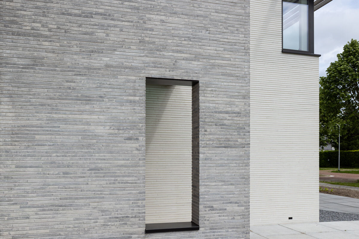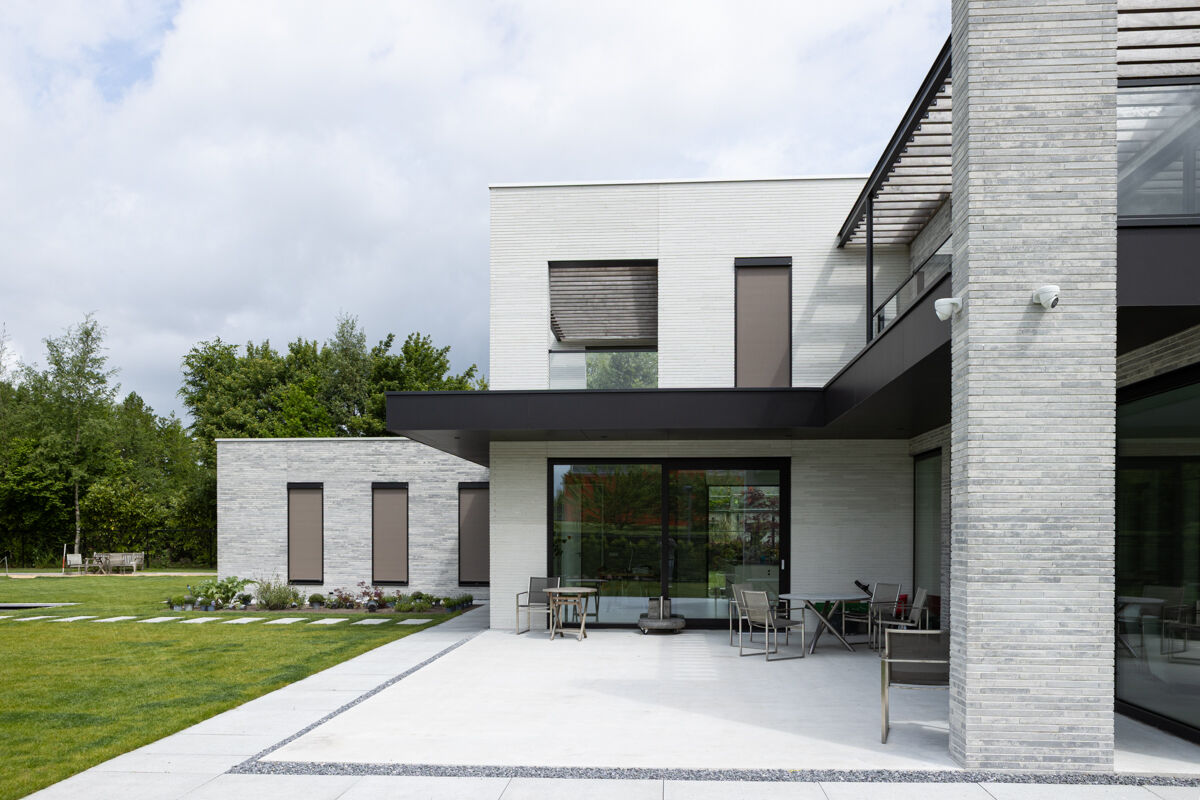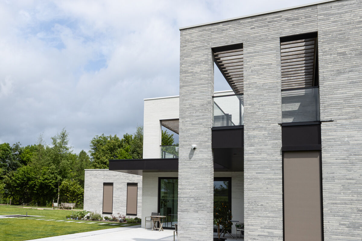Für das hier präsentierte moderne Luxushaus 118-114-ModF-H5 haben sich die Bauherren für eine Variante im Modulformat (ModF) entschieden, so dass die Klinker Maße von 595 x 95 x 40 mm (LxBxH) haben. In Kombination mit dem Strangpress-Verfahren und der Farbe grau nuanciert entsteht dann für das Luxushaus eine ganz eigene Anmutung der Klinkerfassade, die die Architektur unterstützt und Akzente setzt.