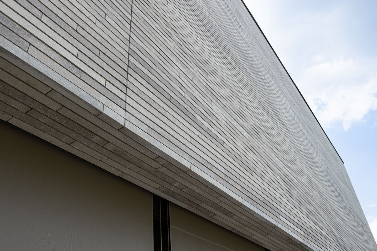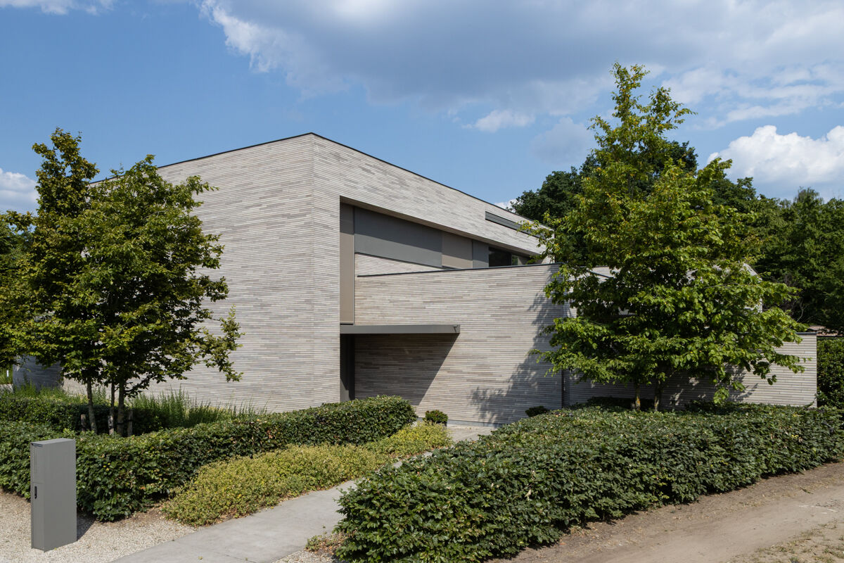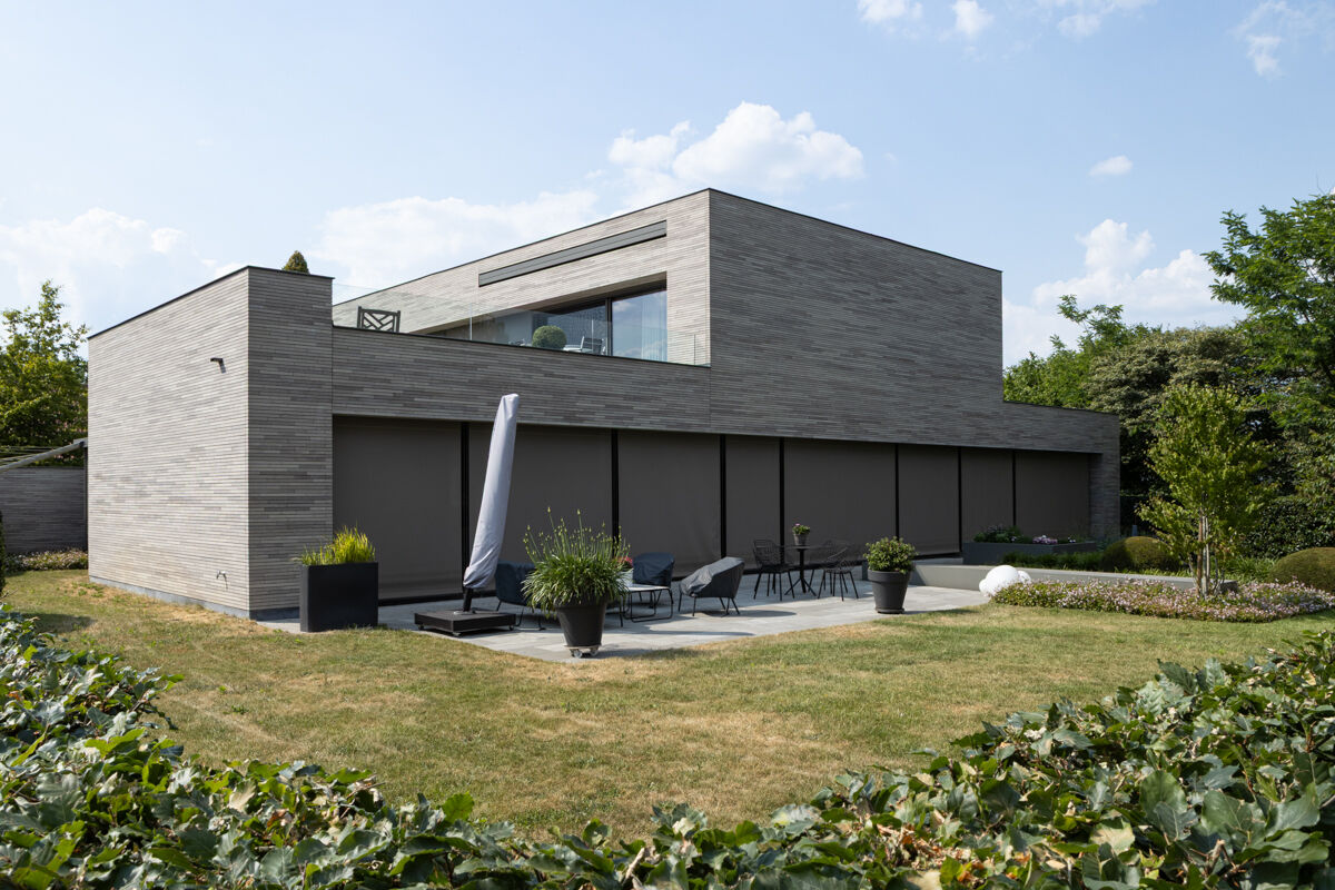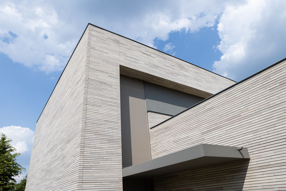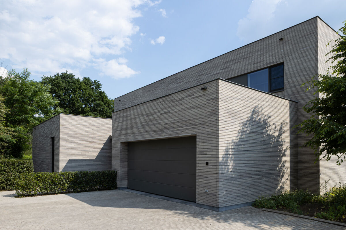 Für das hier präsentierte moderne Luxushaus 118-115-ModF-H6 haben sich die Bauherren für eine Variante im Modulformat (ModF) entschieden, so dass die Klinker Maße von 595 x 95 x 40 mm (LxBxH) haben. In Kombination mit dem Strangpress-Verfahren und der Farbe grau nuanciert entsteht dann für das Luxushaus eine ganz eigene Anmutung der Klinkerfassade, die die Architektur unterstützt und Akzente setzt.