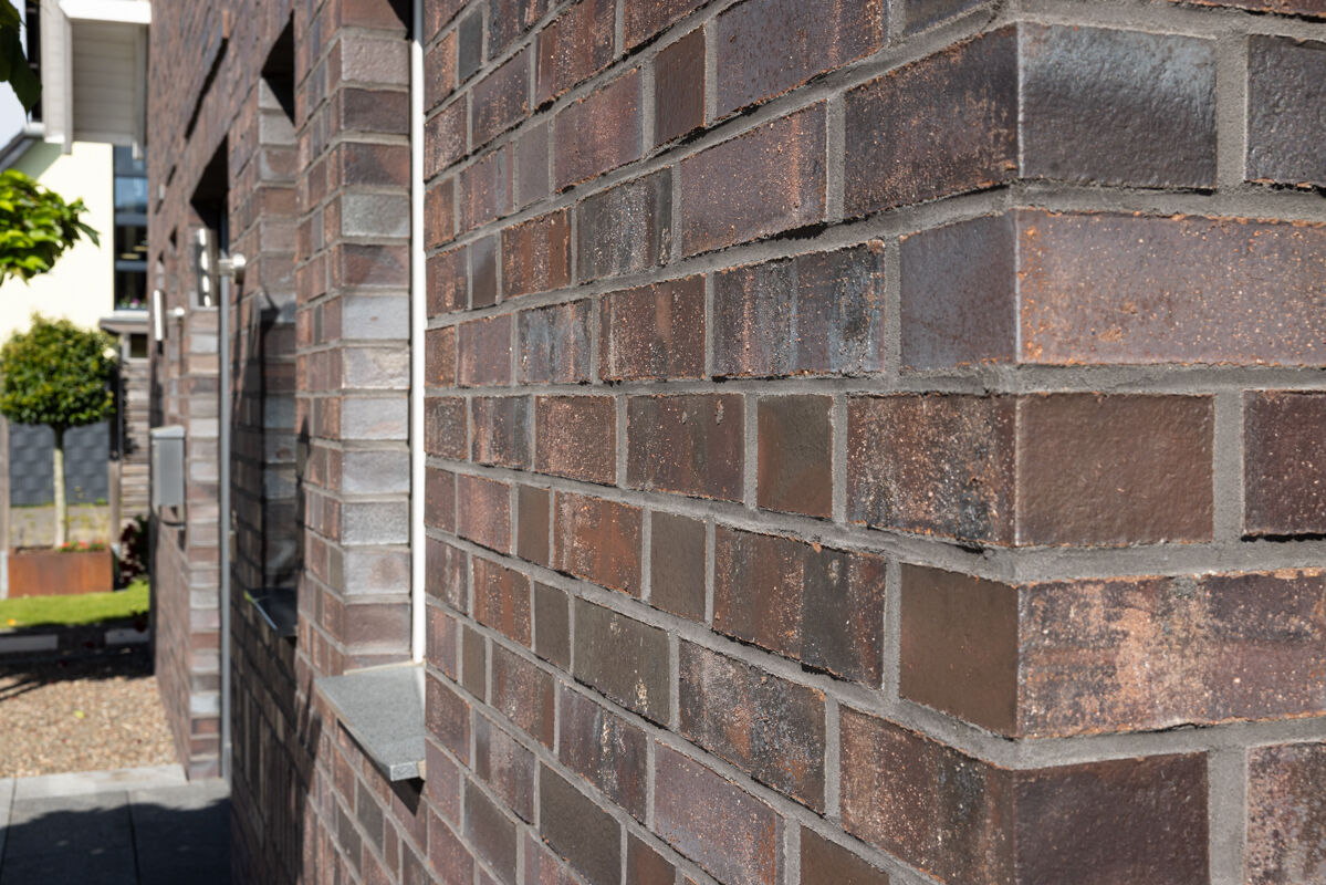 Die Wahl des passenden Klinkers für ein Einfamilienhaus erfolgt in der Regel nach drei Kriterien: Welche Farbe soll der Klinker haben, welches Klinkerformat sollen die Steine haben und nach welchem Herstellungsverfahren werden die Steine produziert. In diesem Fall haben sich die Besitzer des Einfamilienhauses 101-108-NF-H15 für einen Klinkerstein im Normalformat (NF) entschieden, so dass die einzelnen Steine mit den Maßen 240 x 115 x 71 mm (LxBxH) verbaut werden. In Kombination mit dem Strangpress-Verfahren und der Farbe braun - grau - geflammt verleiht dieser Klinker dem Einfamilienhaus eine ganz charakteristische Optik und einen individuellen Charakter.