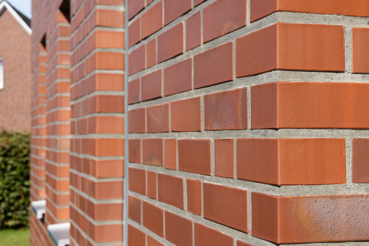 Die Wahl des passenden Klinkers für ein Mehrfamilienhaus erfolgt in der Regel nach drei Kriterien: Welche Farbe soll der Klinker haben, welches Klinkerformat sollen die Steine haben (diese beiden Faktoren prägen, in Kombination mit dem Mauerwerksverband, die Fassade am stärksten) und nach welchem Herstellungsverfahren werden die Steine produziert. In diesem Fall hat man sich bei der Planung des Mehrfamilienhauses 102-101-NF-H4 für einen Klinkerstein im Normalformat (NF) entschieden, so dass die einzelnen Steine mit den Maßen 240 x 115 x 71 mm (LxBxH) verbaut werden. In Kombination mit dem Strangpress-Verfahren und der Farbe Rot - Kohle verleiht dieser Klinker dem Mehrfamilienhaus eine ganz charakteristische Optik und einen individuellen Charakter.