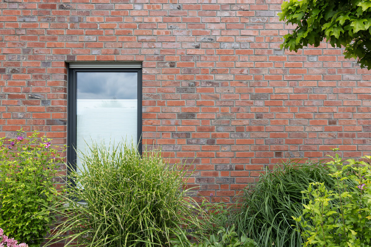 Die Wahl des passenden Klinkers für ein Einfamilienhaus erfolgt in der Regel nach drei Kriterien: Welche Farbe soll der Klinker haben, welches Klinkerformat sollen die Steine haben und nach welchem Herstellungsverfahren werden die Steine produziert. In diesem Fall haben sich die Besitzer des Einfamilienhauses 116-117-NF-H2 für einen Klinkerstein im Normalformat (NF) entschieden, so dass die einzelnen Steine mit den Maßen 240 x 115 x 71 mm (LxBxH) verbaut werden. In Kombination mit dem Ringofen-Verfahren und der Farbe rot kohle bunt verleiht dieser Klinker dem Einfamilienhaus eine ganz charakteristische Optik und einen individuellen Charakter.