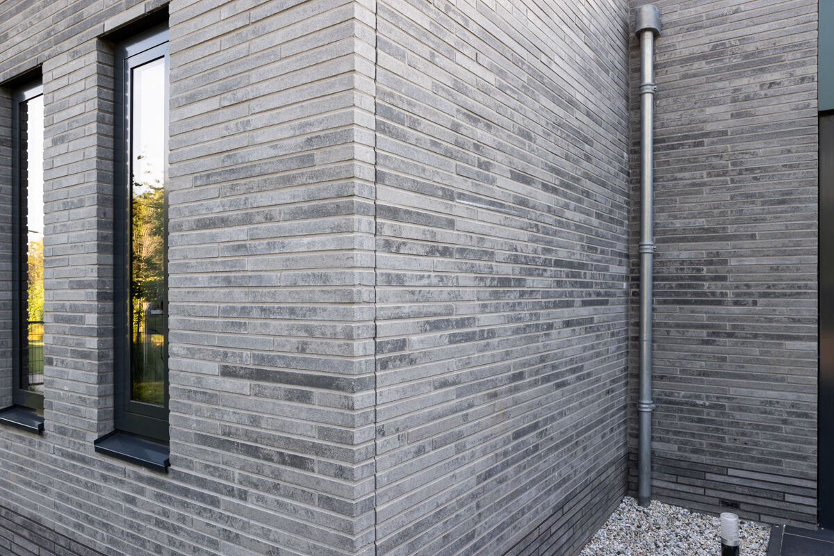 Die hier abgebildete Immobilie ist ein Einfamilienhaus 118-101-ModF-H22, dessen Fassade mit dem Strangpress-Klinker BK-118-101-ModF (Modulformat-Klinkerstein (ModF)) grau nuanciert gestaltet wurde. Die verwendeten Klinker haben ein Modulformat (ModF) mit Abmessungen von 595 x 95 x 40 mm (LxBxH) und werden aus Beton hergestellt. Die Produktion der Klinker für das Einfamilienhaus erfolgt im Strangpress-Verfahren. Für die Klinkerfassade des Einfamilienhauses 118-101-ModF-H22 werden pro Quadratmeter Fassadenfläche 38 Klinkersteine verwendet, den dort verwendeten Klinker finden Sie hier: Zum Strangpress-Klinker BK-118-101-ModF (Modulformat-Klinkerstein (ModF)) grau nuanciert