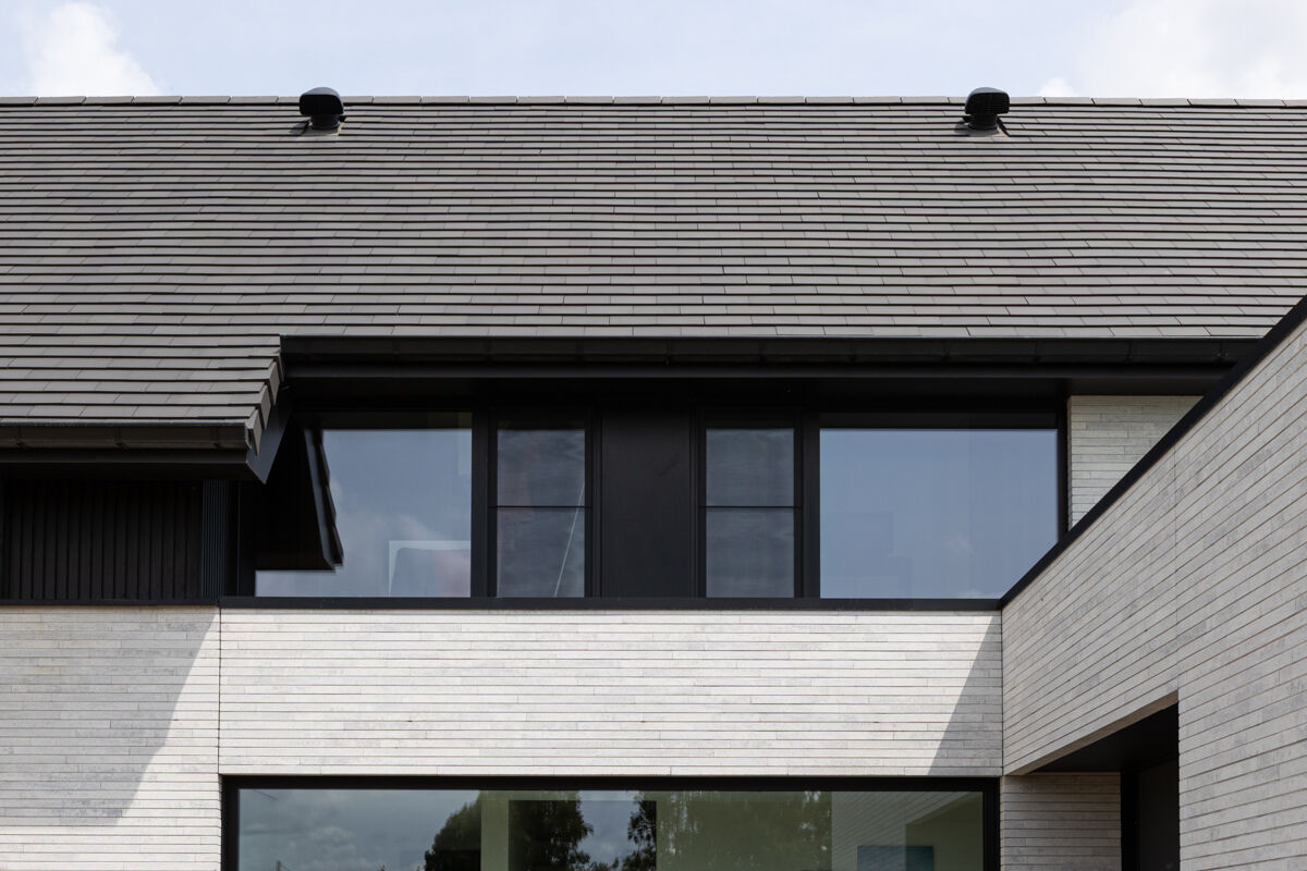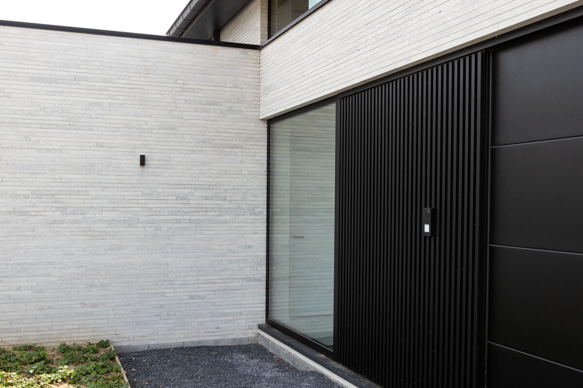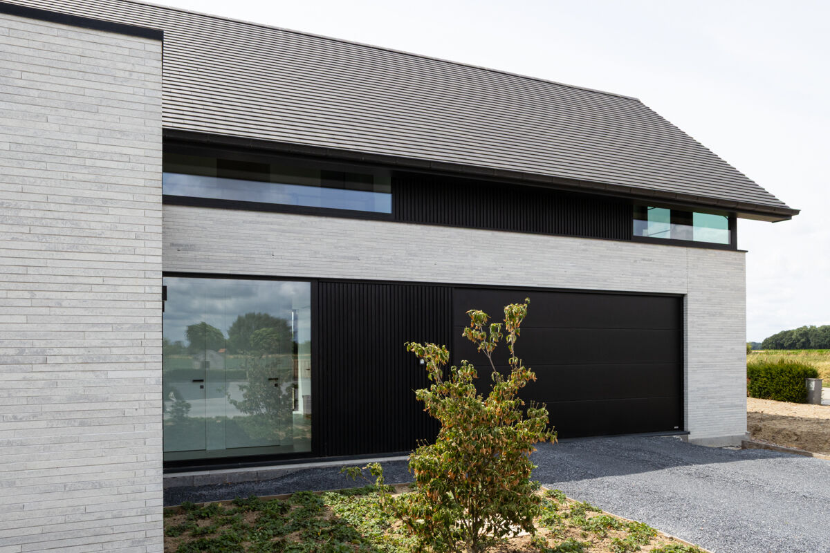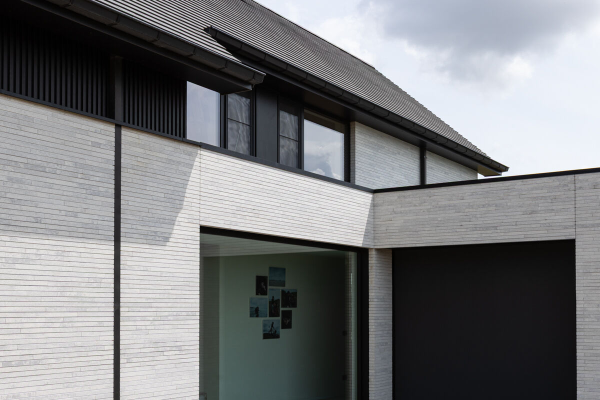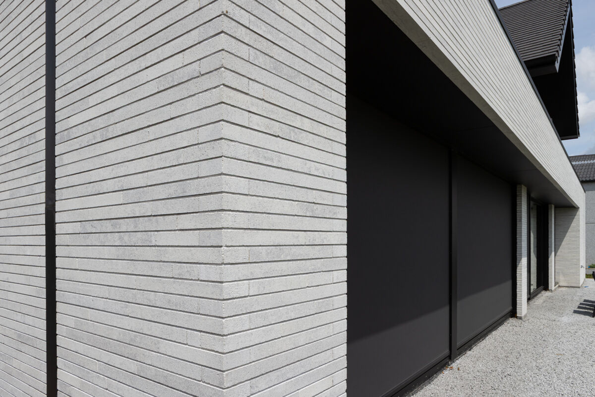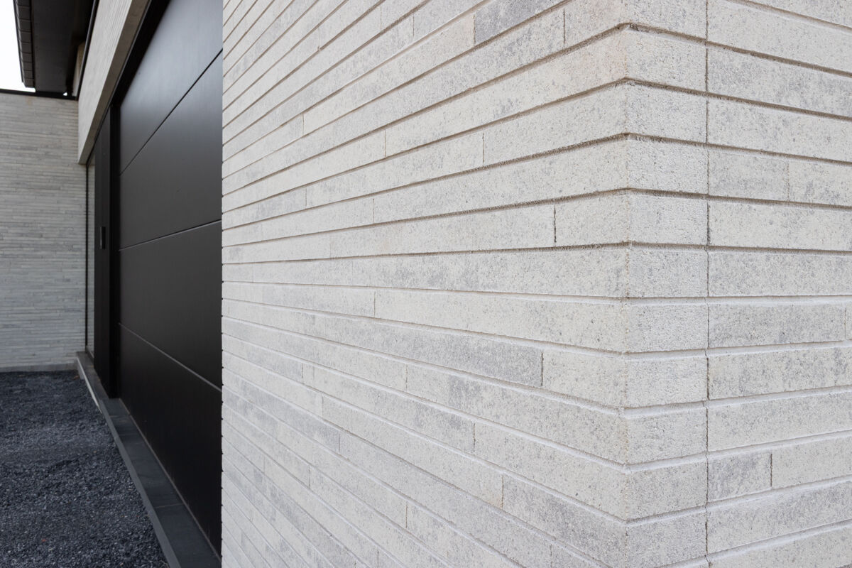 Für das hier präsentierte moderne Luxushaus 118-109-ModF-H6 haben sich die Bauherren für eine Variante im Modulformat (ModF) entschieden, so dass die Klinker Maße von 595 x 95 x 40 mm (LxBxH) haben. In Kombination mit dem Strangpress-Verfahren und der Farbe grau weiß nuanciert entsteht dann für das Luxushaus eine ganz eigene Anmutung der Klinkerfassade, die die Architektur unterstützt und Akzente setzt.