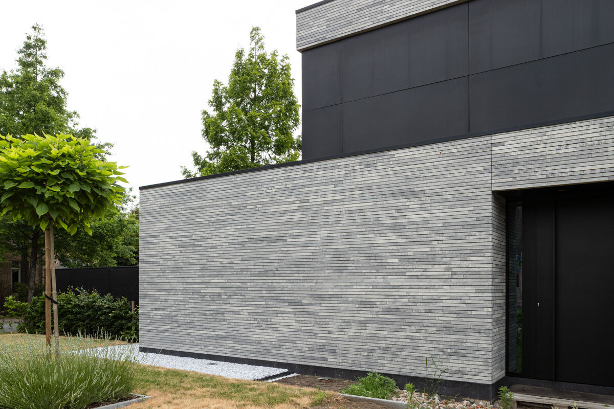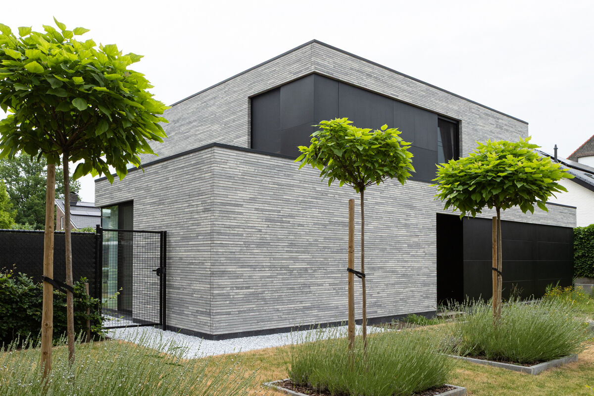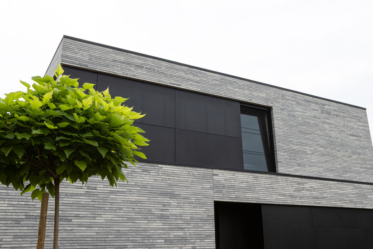 Die hier abgebildete Immobilie ist ein Einfamilienhaus 118-114-ModF-H7, dessen Fassade mit dem Strangpress-Klinker BK-118-114-ModF (Modulformat-Klinkerstein (ModF)) grau nuanciert gestaltet wurde. Die verwendeten Klinker haben ein Modulformat (ModF) mit Abmessungen von 595 x 95 x 40 mm (LxBxH) und werden aus Beton hergestellt. Die Produktion der Klinker für das Einfamilienhaus erfolgt im Strangpress-Verfahren. Für die Klinkerfassade des Einfamilienhauses 118-114-ModF-H7 werden pro Quadratmeter Fassadenfläche 38 Klinkersteine verwendet, den dort verwendeten Klinker finden Sie hier: Zum Strangpress-Klinker BK-118-114-ModF (Modulformat-Klinkerstein (ModF)) grau nuanciert