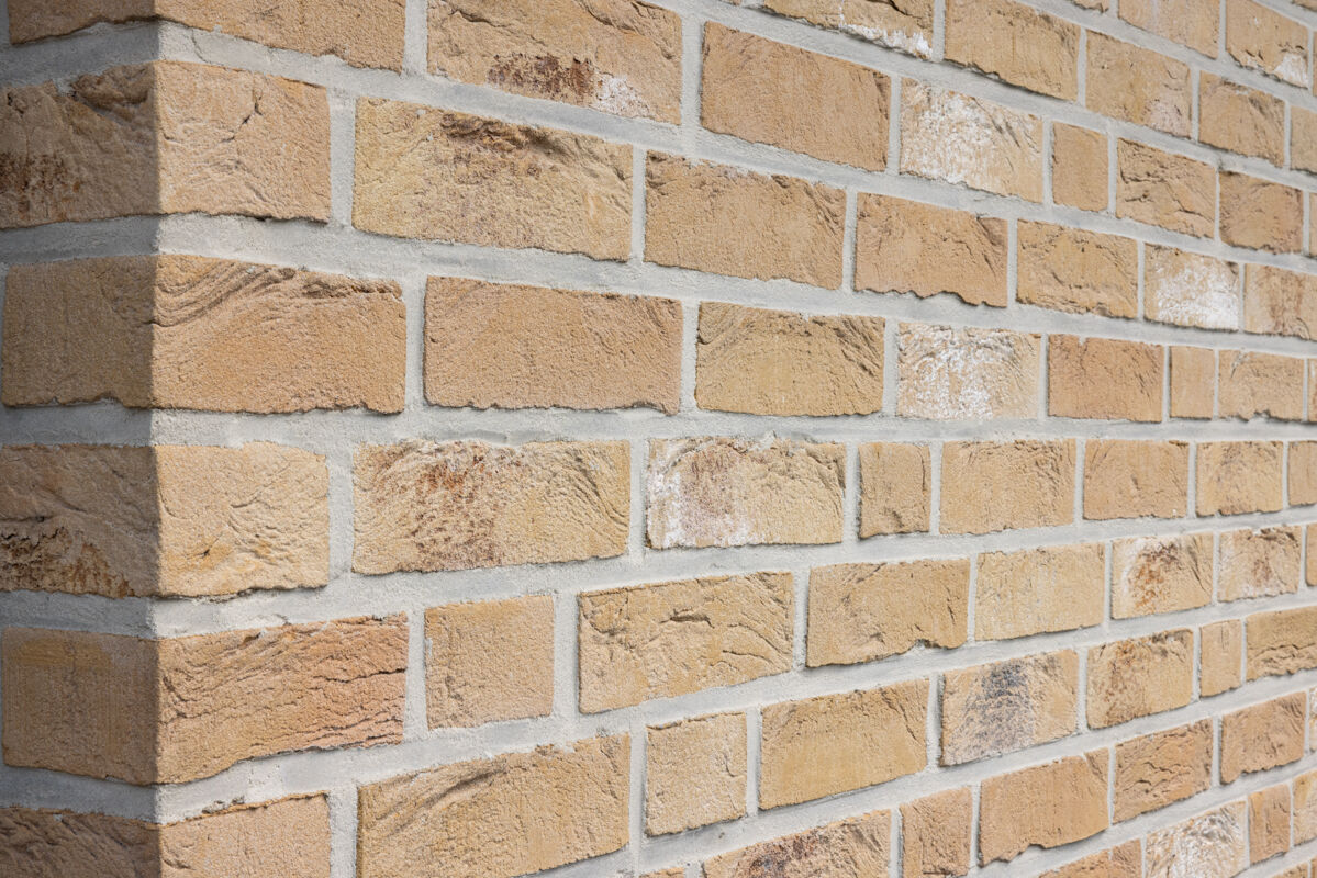 Die Wahl des passenden Klinkers für ein Einfamilienhaus erfolgt in der Regel nach drei Kriterien: Welche Farbe soll der Klinker haben, welches Klinkerformat sollen die Steine haben und nach welchem Herstellungsverfahren werden die Steine produziert. In diesem Fall haben sich die Besitzer des Einfamilienhauses 103-113-WDF-H10 für einen Klinkerstein im Waaldickformat (WDF) entschieden, so dass die einzelnen Steine mit den Maßen 210 x 100 x 65 mm (LxBxH) verbaut werden. In Kombination mit dem Handform-Verfahren und der Farbe gelb-nuanciert verleiht dieser Klinker dem Einfamilienhaus eine ganz charakteristische Optik und einen individuellen Charakter.