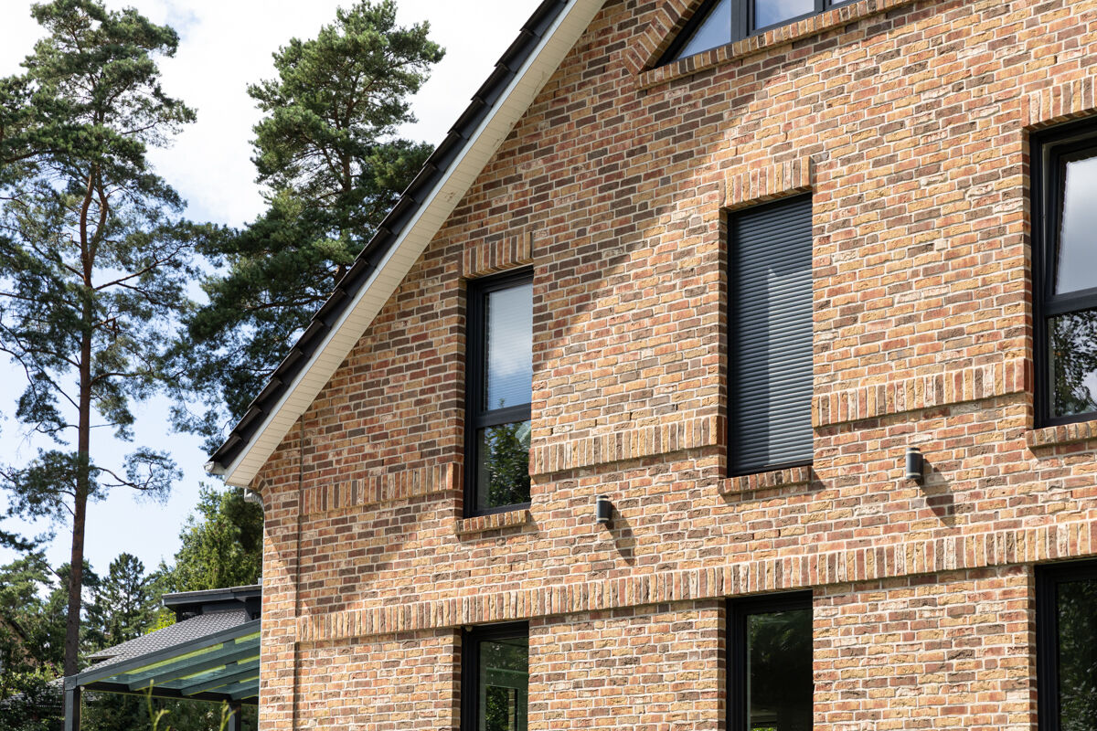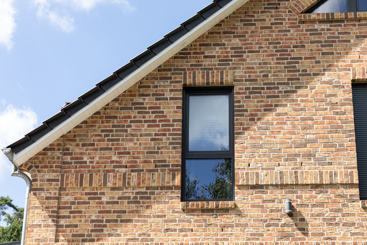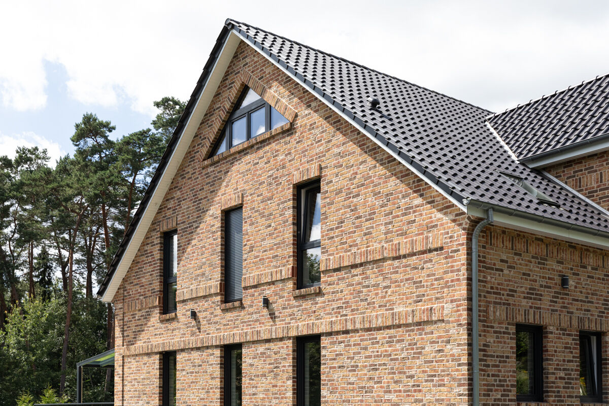 Einfamilienhäuser, insbesondere solche mit einer Klinkerfassade wie bei dem hier gezeigten Objekt mit dem Handform-Klinker BK-104-109-NF (Normalformat-Klinkerstein (NF)) rot-bunt, sind typischerweise eher in kleineren Städten, ländlichen Regionen oder städtischem Umland zu finden. Auch im Zuge der Nachverdichtung vieler Städte gehören einzelnstehende Einfamilienhäuser weiterhin zu den favorisierten Häusertypen, wenn es um eigene Immobilien geht, denn Objekte wie das Einfamilienhaus 104-109-NF-H19 geben den Besitzern maximale Freiheit und Unabhängigkeit von der Nachbarschaft.