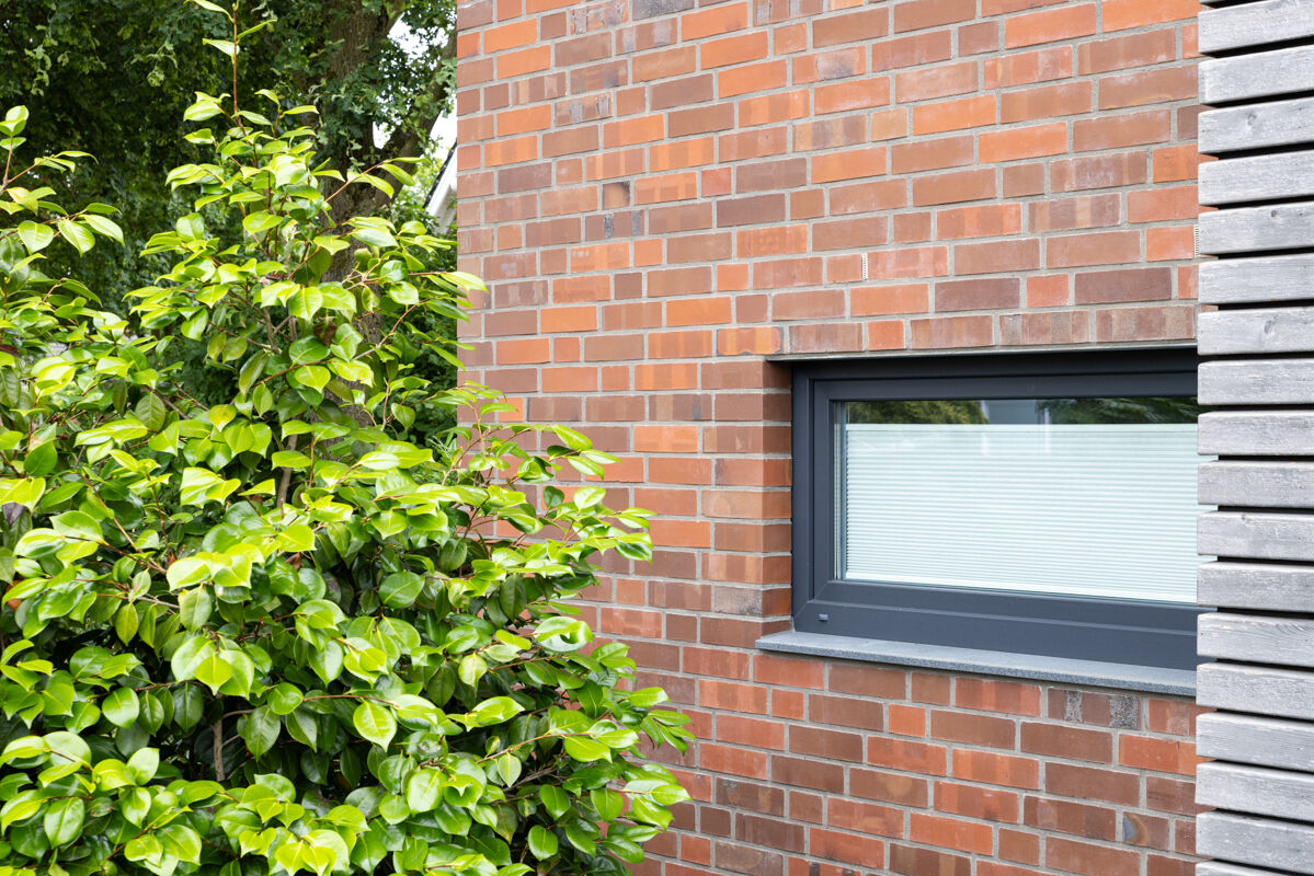 Die Wahl des passenden Klinkers für ein Einfamilienhaus erfolgt in der Regel nach drei Kriterien: Welche Farbe soll der Klinker haben, welches Klinkerformat sollen die Steine haben und nach welchem Herstellungsverfahren werden die Steine produziert. In diesem Fall haben sich die Besitzer des Einfamilienhauses 102-116-NF-H3 für einen Klinkerstein im Normalformat (NF) entschieden, so dass die einzelnen Steine mit den Maßen 240 x 115 x 71 mm (LxBxH) verbaut werden. In Kombination mit dem Strangpress-Verfahren und der Farbe braun-rot verleiht dieser Klinker dem Einfamilienhaus eine ganz charakteristische Optik und einen individuellen Charakter.