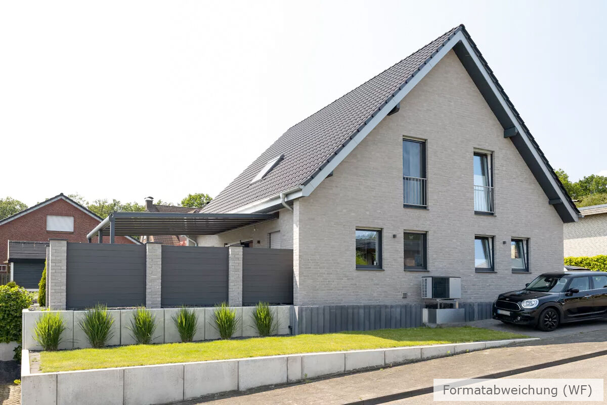 Die hier abgebildete Immobilie ist ein Einfamilienhaus 103-159-WDF-H14, dessen Fassade mit dem Handform-Klinker BK-103-159-WDF (Waaldickformat-Klinkerstein (WDF)) grau gestaltet wurde. Die verwendeten Klinker haben ein Waaldickformat (WDF) mit Abmessungen von 210 x 100 x 65 mm (LxBxH) und werden aus gebrannter Ton hergestellt. Die Produktion der Klinker für das Einfamilienhaus erfolgt im Handform-Verfahren. Für die Klinkerfassade des Einfamilienhauses 103-159-WDF-H14 werden pro Quadratmeter Fassadenfläche 58 Klinkersteine verwendet, den dort verwendeten Klinker finden Sie hier: Zum Handform-Klinker BK-103-159-WDF (Waaldickformat-Klinkerstein (WDF)) grau