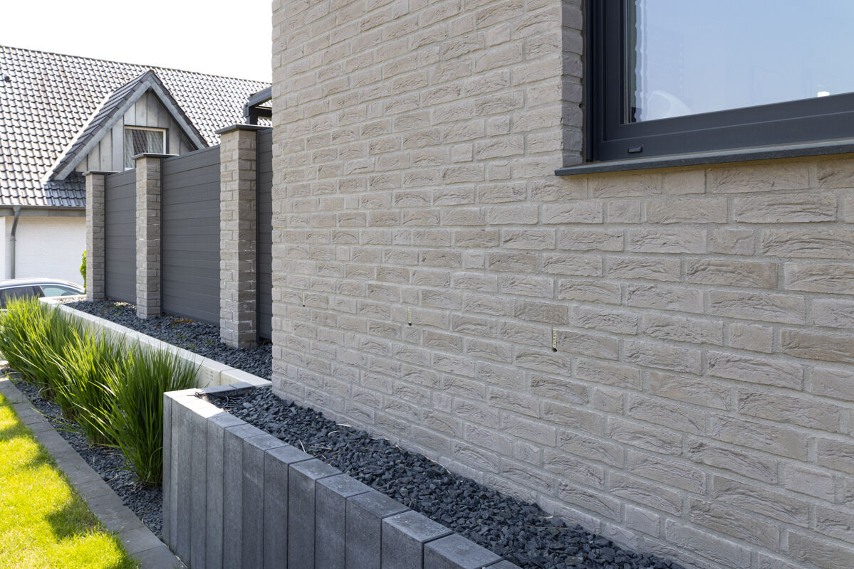 Die Wahl des passenden Klinkers für ein Einfamilienhaus erfolgt in der Regel nach drei Kriterien: Welche Farbe soll der Klinker haben, welches Klinkerformat sollen die Steine haben und nach welchem Herstellungsverfahren werden die Steine produziert. In diesem Fall haben sich die Besitzer des Einfamilienhauses 103-159-WDF-H14 für einen Klinkerstein im Waaldickformat (WDF) entschieden, so dass die einzelnen Steine mit den Maßen 210 x 100 x 65 mm (LxBxH) verbaut werden. In Kombination mit dem Handform-Verfahren und der Farbe grau verleiht dieser Klinker dem Einfamilienhaus eine ganz charakteristische Optik und einen individuellen Charakter.