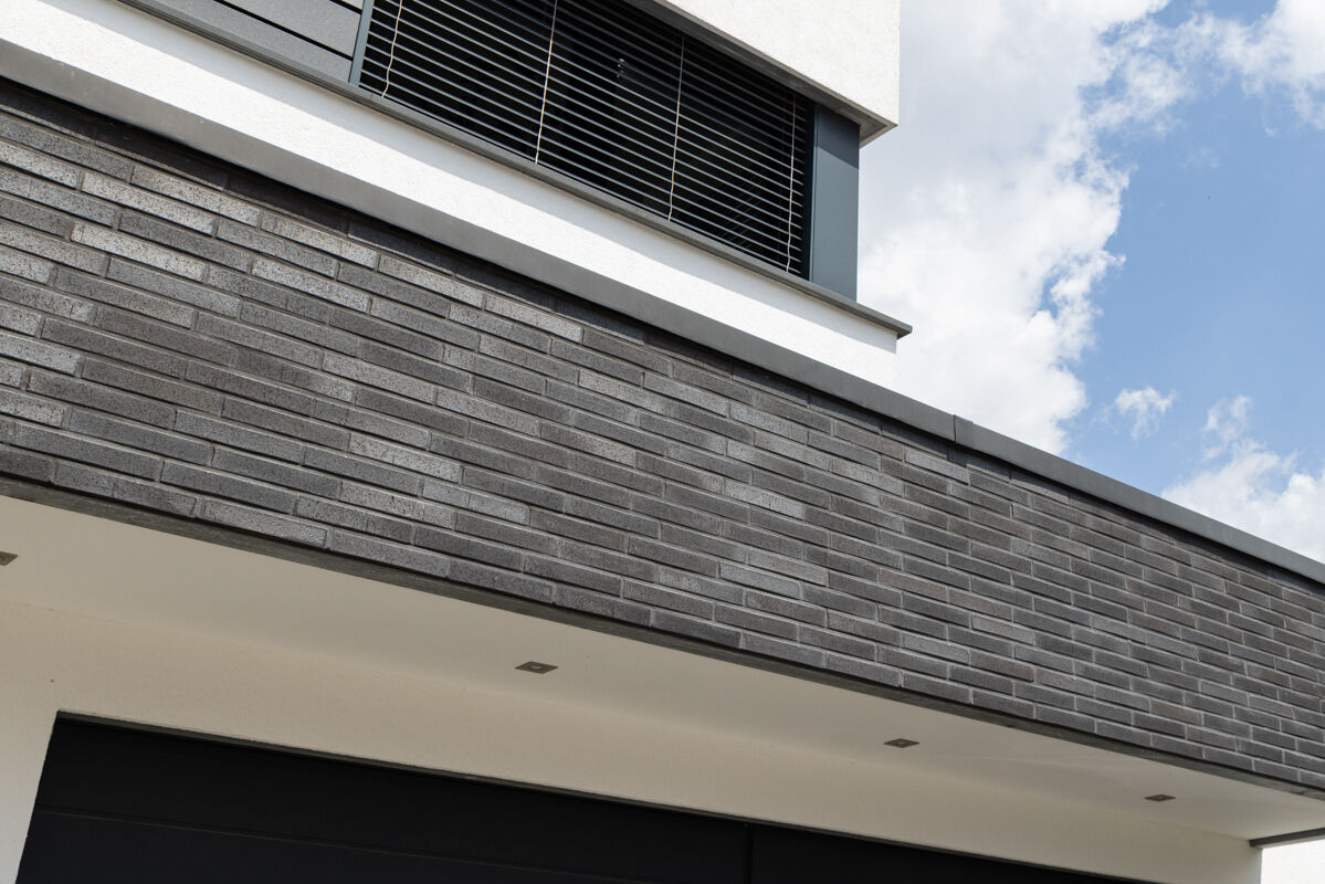 Die hier abgebildete Immobilie ist ein Einfamilienhaus 108-185-ModF-H1, dessen Fassade mit dem Strangpress-Klinker BK-108-185-ModF (Modulformat-Klinkerstein (ModF)) schwarz-grau gestaltet wurde. Die verwendeten Klinker haben ein Modulformat (ModF) mit Abmessungen von 290 x 90 x 52 mm (LxBxH) und werden aus gebrannter Ton hergestellt. Die Produktion der Klinker für das Einfamilienhaus erfolgt im Strangpress-Verfahren. Für die Klinkerfassade des Einfamilienhauses 108-185-ModF-H1 werden pro Quadratmeter Fassadenfläche 53 Klinkersteine verwendet, den dort verwendeten Klinker finden Sie hier: Zum Strangpress-Klinker BK-108-185-ModF (Modulformat-Klinkerstein (ModF)) schwarz-grau