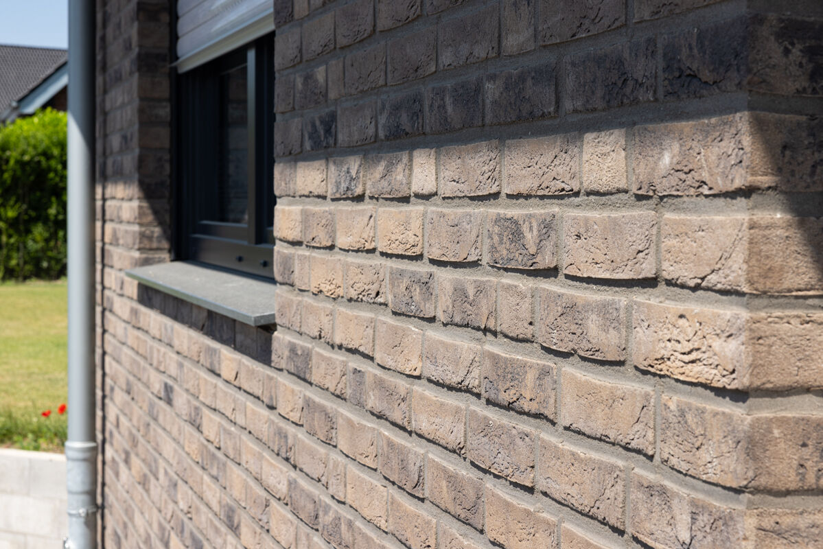 Die Wahl des passenden Klinkers für ein Einfamilienhaus erfolgt in der Regel nach drei Kriterien: Welche Farbe soll der Klinker haben, welches Klinkerformat sollen die Steine haben und nach welchem Herstellungsverfahren werden die Steine produziert. In diesem Fall haben sich die Besitzer des Einfamilienhauses 107-104-WDF-H2 für einen Klinkerstein im Waaldickformat (WDF) entschieden, so dass die einzelnen Steine mit den Maßen 215 x 102 x 65 mm (LxBxH) verbaut werden. In Kombination mit dem Handform-Verfahren und der Farbe grau verleiht dieser Klinker dem Einfamilienhaus eine ganz charakteristische Optik und einen individuellen Charakter.