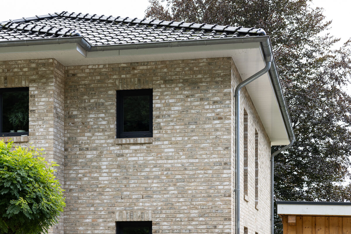 Für die Auswahl des passenden Klinkerstein für die neue Stadtvilla werden typischerweise drei wichtige Fragen gestellt: Welche Farbe soll der Klinker haben? Welches Klinkerformat sollen die Steine haben? Nach welchem Herstellungsverfahren werden die Steine produziert? Bei der hier präsentierten Stadtimmobilie wurde ein Klinkerstein im Waaldickformat (WDF) gewählt, so dass die einzelnen Steine mit den Maßen 210 x 100 x 65 mm (LxBxH) verbaut werden. In Kombination mit dem Handform-Verfahren und der Farbe weiß grau entsteht dann die individuelle Optik der Fassade und kann den Wünschen und Vorstellungen der neuen Besitzer gerecht werden.