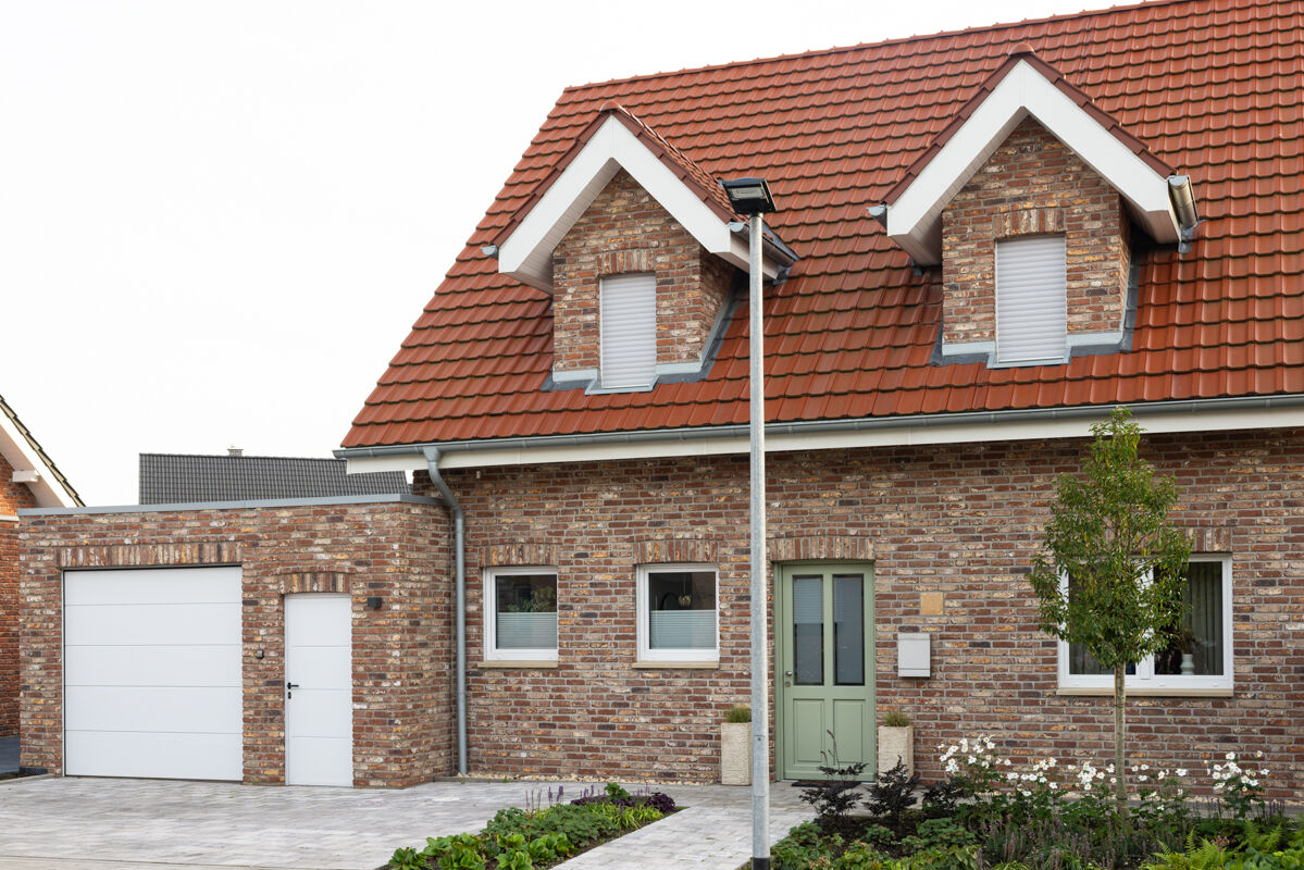 Einfamilienhäuser, insbesondere solche mit einer Klinkerfassade wie bei dem hier gezeigten Objekt mit dem Handform-Klinker BK-103-111-WDF (Waaldickformat-Klinkerstein (WDF)) rot-bunt, sind typischerweise eher in kleineren Städten, ländlichen Regionen oder städtischem Umland zu finden. Auch im Zuge der Nachverdichtung vieler Städte gehören einzelnstehende Einfamilienhäuser weiterhin zu den favorisierten Häusertypen, wenn es um eigene Immobilien geht, denn Objekte wie das Einfamilienhaus 103-111-WDF-H27 geben den Besitzern maximale Freiheit und Unabhängigkeit von der Nachbarschaft.