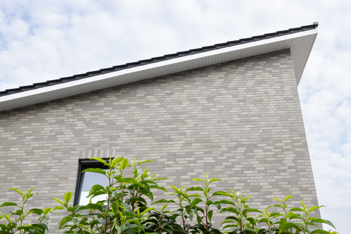 Die Wahl des passenden Klinkers für ein Mehrfamilienhaus erfolgt in der Regel nach drei Kriterien: Welche Farbe soll der Klinker haben, welches Klinkerformat sollen die Steine haben (diese beiden Faktoren prägen, in Kombination mit dem Mauerwerksverband, die Fassade am stärksten) und nach welchem Herstellungsverfahren werden die Steine produziert. In diesem Fall hat man sich bei der Planung des Mehrfamilienhauses 104-188-ModF-H1 für einen Klinkerstein im Modulformat (ModF) entschieden, so dass die einzelnen Steine mit den Maßen 290 x 90 x 52 mm (LxBxH) verbaut werden. In Kombination mit dem Strangpress-Verfahren und der Farbe grau bunt verleiht dieser Klinker dem Mehrfamilienhaus eine ganz charakteristische Optik und einen individuellen Charakter.