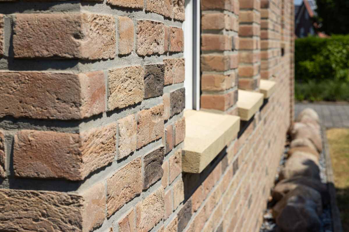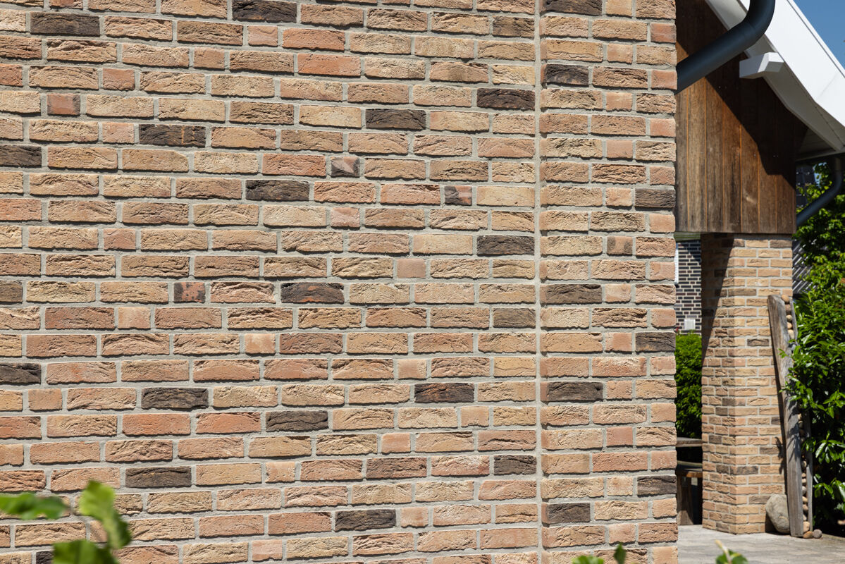 Die Wahl des passenden Klinkers für ein Einfamilienhaus erfolgt in der Regel nach drei Kriterien: Welche Farbe soll der Klinker haben, welches Klinkerformat sollen die Steine haben und nach welchem Herstellungsverfahren werden die Steine produziert. In diesem Fall haben sich die Besitzer des Einfamilienhauses 105-106-WDF-H12 für einen Klinkerstein im Waaldickformat (WDF) entschieden, so dass die einzelnen Steine mit den Maßen 215 x 100 x 65 mm (LxBxH) verbaut werden. In Kombination mit dem Handform-Verfahren und der Farbe beige-braun verleiht dieser Klinker dem Einfamilienhaus eine ganz charakteristische Optik und einen individuellen Charakter.