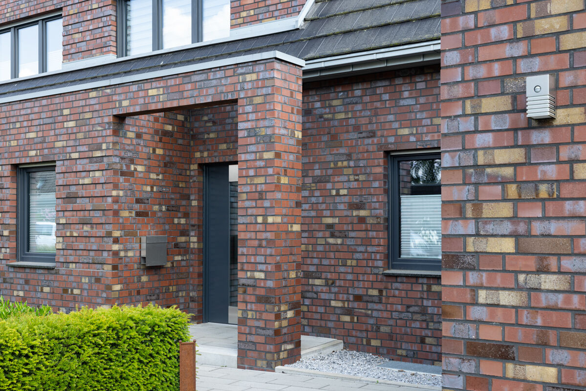 Hat man Antworten für diese drei Fragen gefunden, grenzt sich die große Auswahl der Klinker stark ein und weitere Kriterien wie Preis, Hersteller etc. kommen in Betracht. In diesem Fall haben sich die Bauherren vom Doppelhaus 108-119-NF-H12 für einen Stein im Normalformat (NF) entschieden, so dass Klinker mit den Maßen 240 x 115 x 71 mm (LxBxH) verbaut werden und 48 Klinker pro Quadratmeter verbaut wurden. In Kombination mit dem Strangpress-Verfahren und der Farbe rot-bunt verleiht dieser Fassadenklinker dem Doppelhaus die hier präsentierte Optik und den individuellen Charakter.