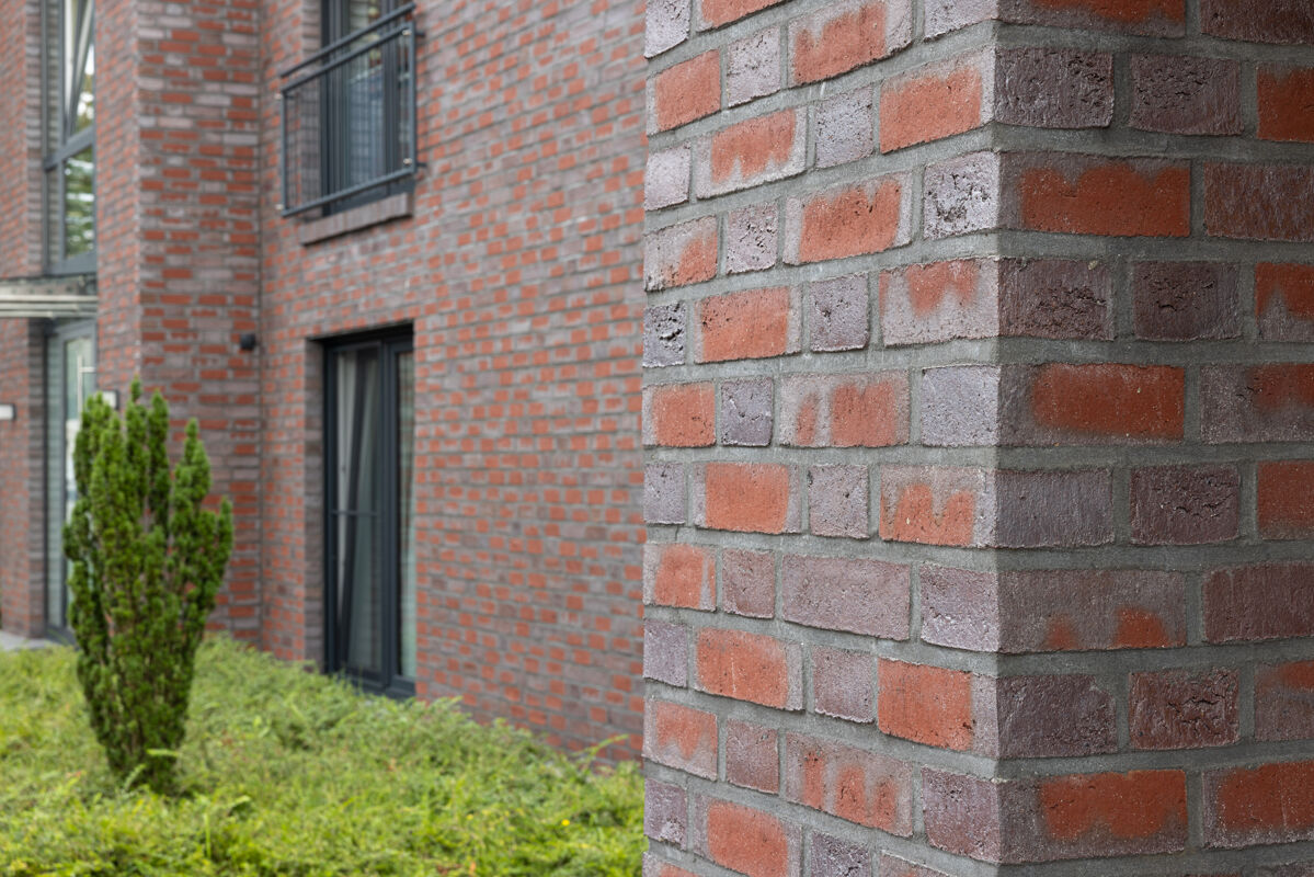 Die Wahl des passenden Klinkers für ein Mehrfamilienhaus erfolgt in der Regel nach drei Kriterien: Welche Farbe soll der Klinker haben, welches Klinkerformat sollen die Steine haben (diese beiden Faktoren prägen, in Kombination mit dem Mauerwerksverband, die Fassade am stärksten) und nach welchem Herstellungsverfahren werden die Steine produziert. In diesem Fall hat man sich bei der Planung des Mehrfamilienhauses 107-133-NF-H4 für einen Klinkerstein im Normalformat (NF) entschieden, so dass die einzelnen Steine mit den Maßen 240 x 115 x 71 mm (LxBxH) verbaut werden. In Kombination mit dem Wasserstrich-Verfahren und der Farbe rot - blau - bunt verleiht dieser Klinker dem Mehrfamilienhaus eine ganz charakteristische Optik und einen individuellen Charakter.