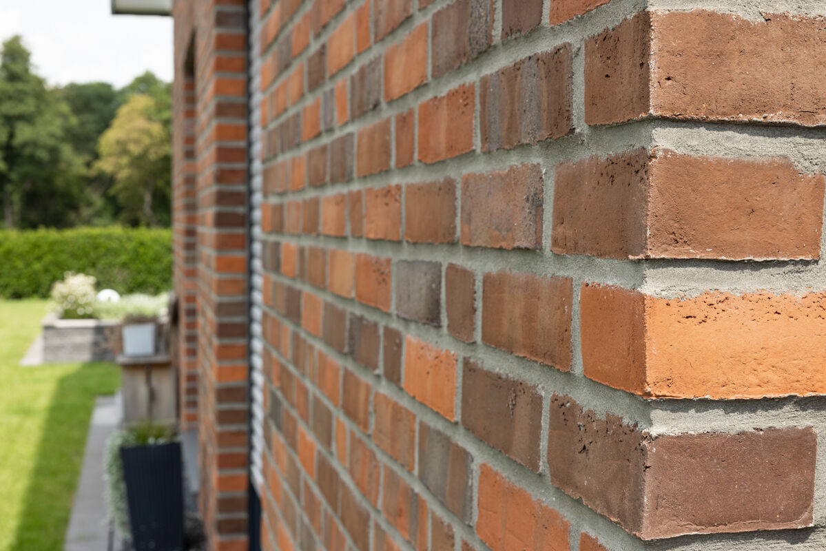 Die Wahl des passenden Klinkers für ein Einfamilienhaus erfolgt in der Regel nach drei Kriterien: Welche Farbe soll der Klinker haben, welches Klinkerformat sollen die Steine haben und nach welchem Herstellungsverfahren werden die Steine produziert. In diesem Fall haben sich die Besitzer des Einfamilienhauses 102-123-NF-H2 für einen Klinkerstein im Normalformat (NF) entschieden, so dass die einzelnen Steine mit den Maßen 240 x 115 x 71 mm (LxBxH) verbaut werden. In Kombination mit dem Wasserstrich-Verfahren und der Farbe braun-rot verleiht dieser Klinker dem Einfamilienhaus eine ganz charakteristische Optik und einen individuellen Charakter.