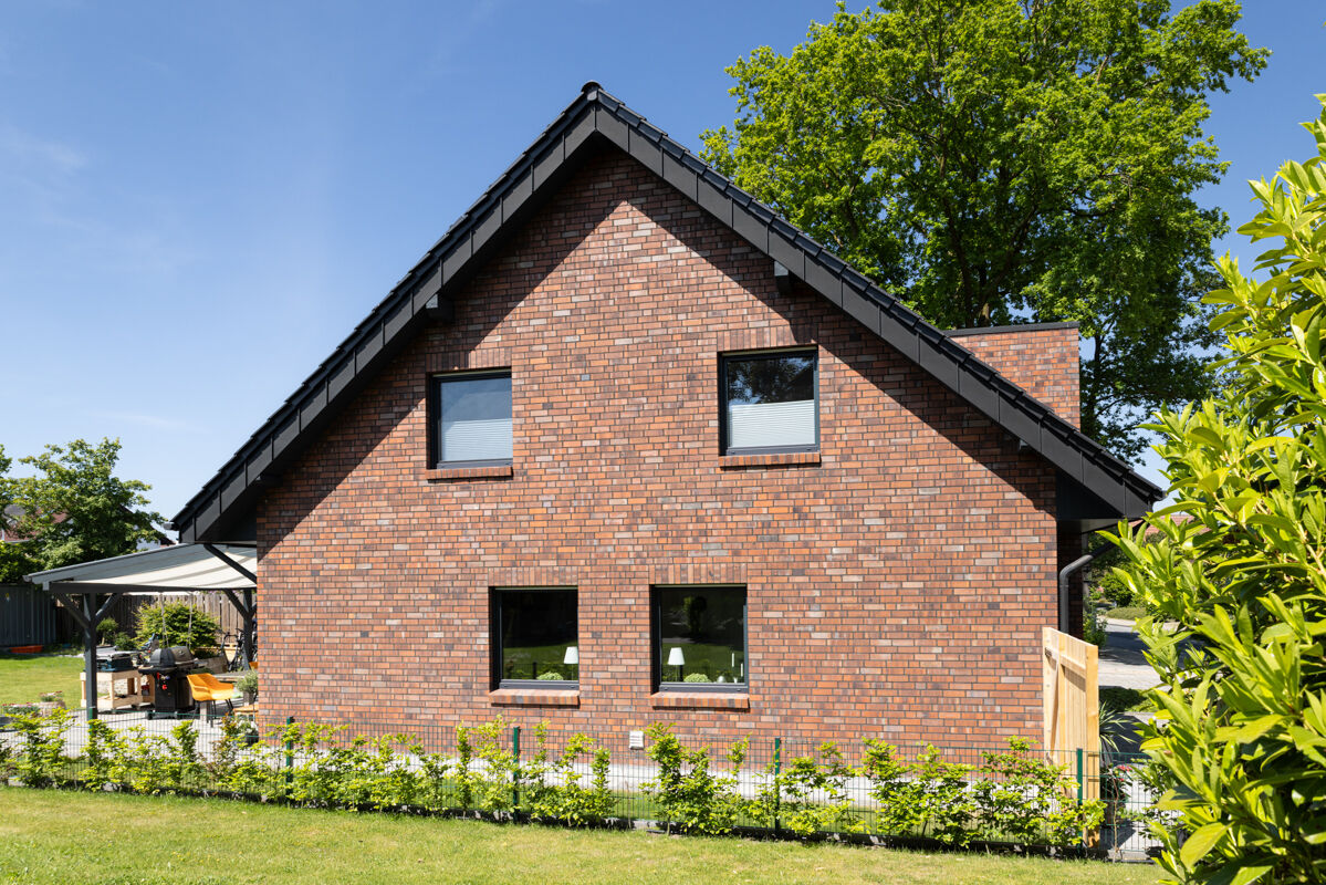 Einfamilienhäuser, insbesondere solche mit einer Klinkerfassade wie bei dem hier gezeigten Objekt mit dem Strangpress-Klinker BK-102-128-NF (Normalformat-Klinkerstein (NF)) rot - blau - bunt, sind typischerweise eher in kleineren Städten, ländlichen Regionen oder städtischem Umland zu finden. Auch im Zuge der Nachverdichtung vieler Städte gehören einzelnstehende Einfamilienhäuser weiterhin zu den favorisierten Häusertypen, wenn es um eigene Immobilien geht, denn Objekte wie das Einfamilienhaus 102-128-NF-H3 geben den Besitzern maximale Freiheit und Unabhängigkeit von der Nachbarschaft.