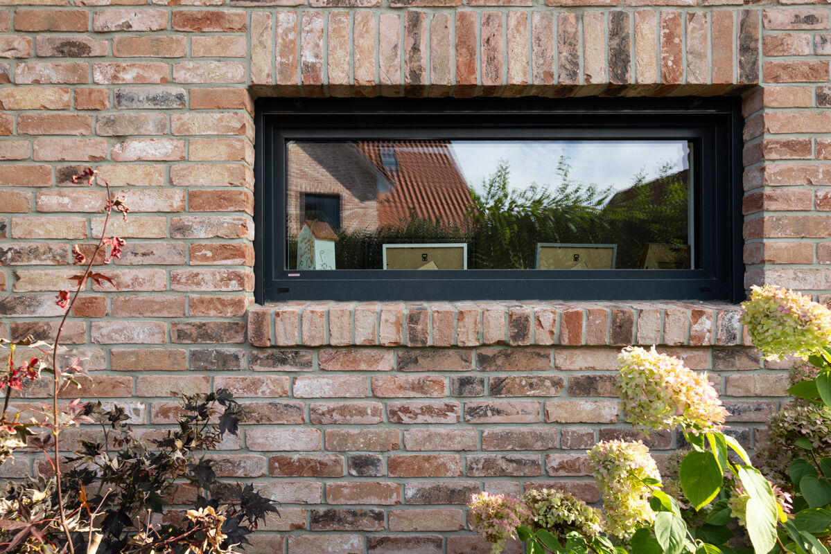 Die Wahl des passenden Klinkers für ein Einfamilienhaus erfolgt in der Regel nach drei Kriterien: Welche Farbe soll der Klinker haben, welches Klinkerformat sollen die Steine haben und nach welchem Herstellungsverfahren werden die Steine produziert. In diesem Fall haben sich die Besitzer des Einfamilienhauses 107-193-NF-H1 für einen Klinkerstein im Normalformat (NF) entschieden, so dass die einzelnen Steine mit den Maßen 240 x 115 x 71 mm (LxBxH) verbaut werden. In Kombination mit dem Handform-Verfahren und der Farbe rot braun bunt verleiht dieser Klinker dem Einfamilienhaus eine ganz charakteristische Optik und einen individuellen Charakter.