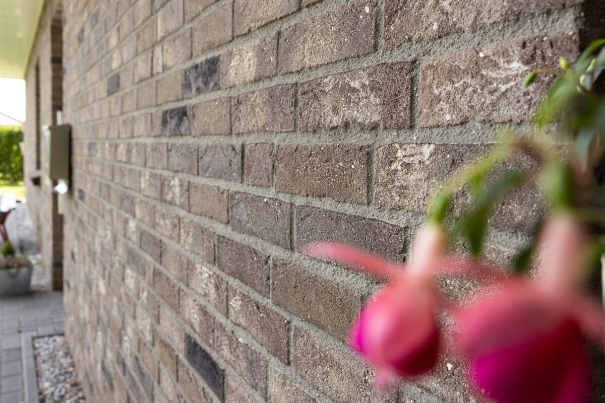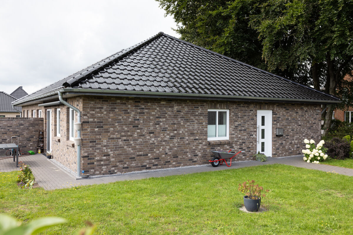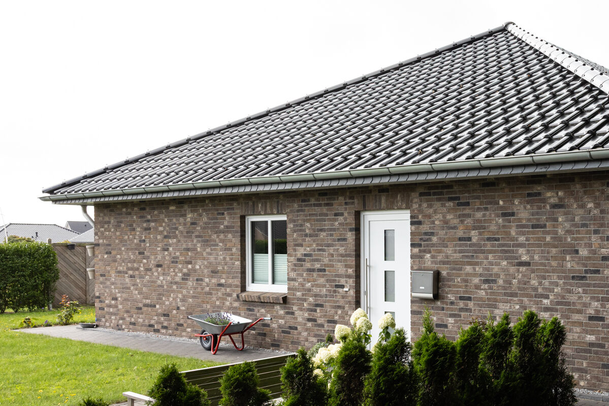 In diesem Fall haben sich die Bauherren bei der Planung des Bungalows 107-196-WDF-H1 für einen Klinkerstein im Waaldickformat (WDF) entschieden, so dass die einzelnen Steine mit den Maßen 210 x 100 x 65 mm (LxBxH) verbaut werden. In Kombination mit dem Handform-Verfahren und der Farbe braun bunt verleiht dieser Klinker dem Bungalow eine charakterstarke und zeitlos elegante Optik.