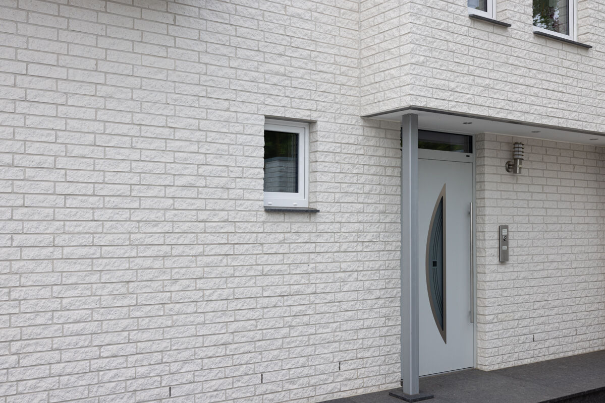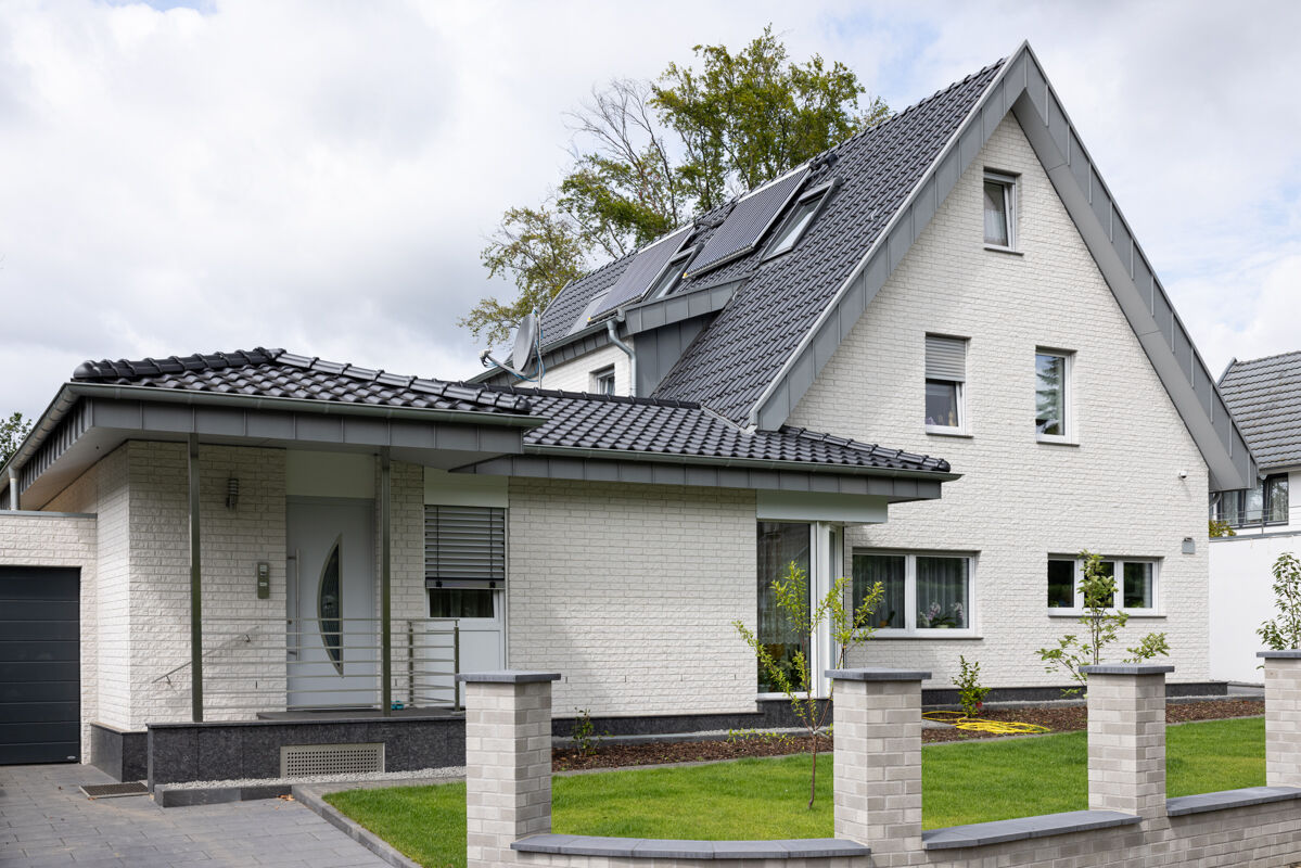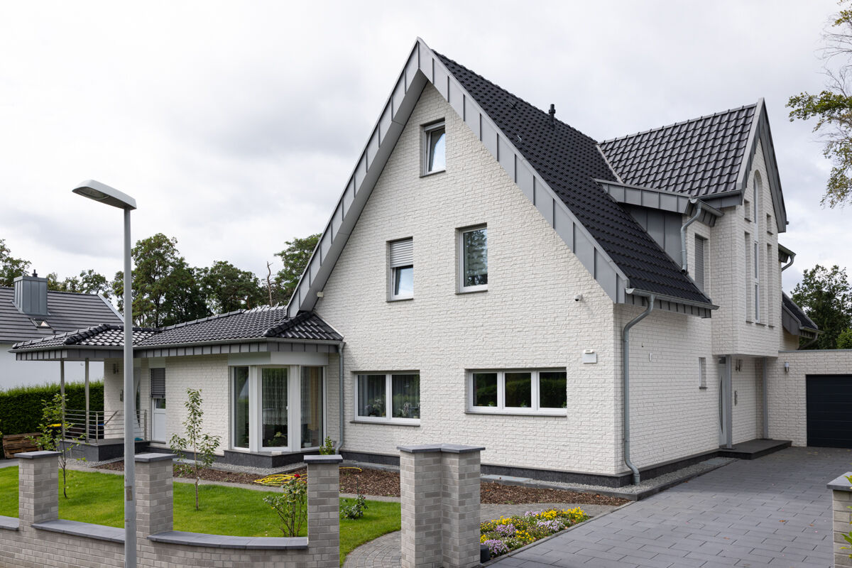 Einfamilienhäuser, insbesondere solche mit einer Klinkerfassade wie bei dem hier gezeigten Objekt mit dem Strangpress-Klinker / Verblender BK-109-106-NF (Normalformat-Klinkerstein (NF)) weiß, sind typischerweise eher in kleineren Städten, ländlichen Regionen oder städtischem Umland zu finden. Auch im Zuge der Nachverdichtung vieler Städte gehören einzelnstehende Einfamilienhäuser weiterhin zu den favorisierten Häusertypen, wenn es um eigene Immobilien geht, denn Objekte wie das Einfamilienhaus 109-106-NF-H2 geben den Besitzern maximale Freiheit und Unabhängigkeit von der Nachbarschaft.