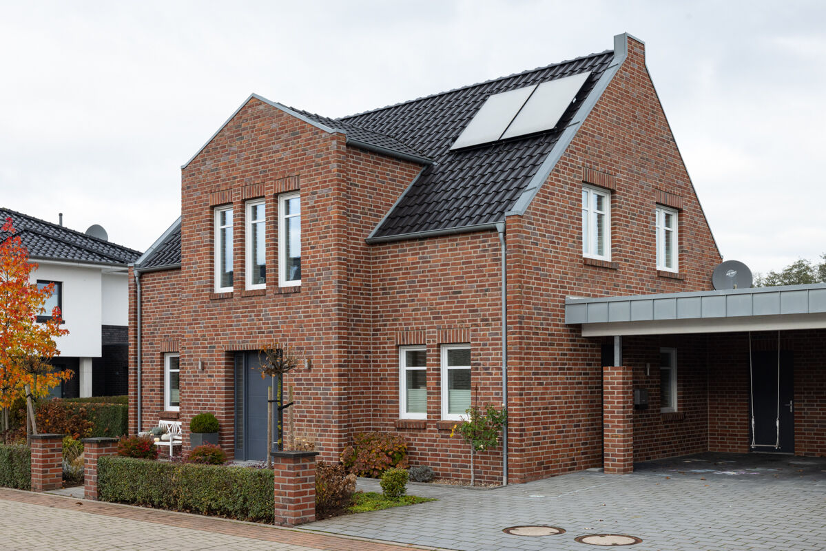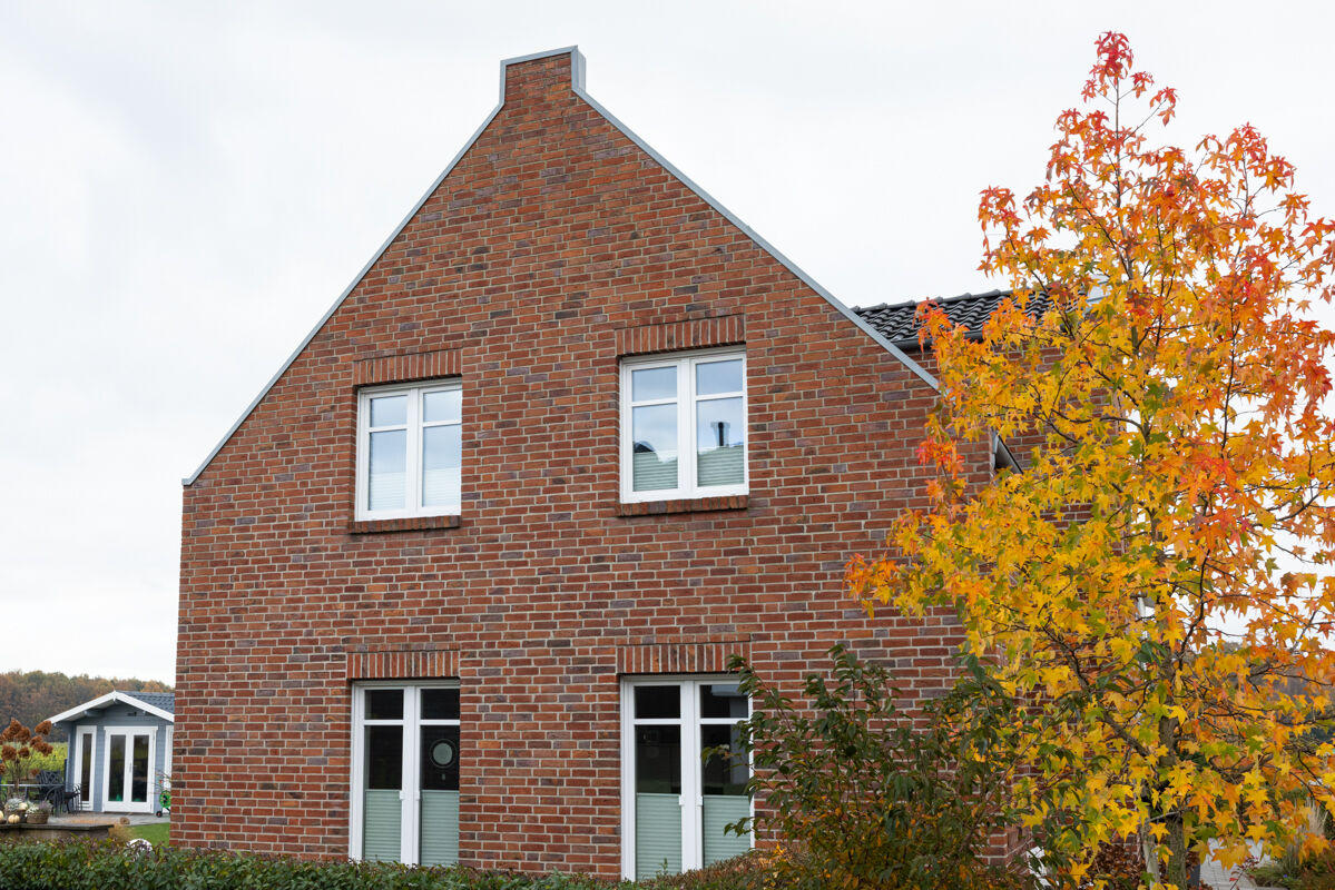 Einfamilienhäuser, insbesondere solche mit einer Klinkerfassade wie bei dem hier gezeigten Objekt mit dem Wasserstrich-Klinker BK-111-124-NF (Normalformat-Klinkerstein (NF)) rot bunt, sind typischerweise eher in kleineren Städten, ländlichen Regionen oder städtischem Umland zu finden. Auch im Zuge der Nachverdichtung vieler Städte gehören einzelnstehende Einfamilienhäuser weiterhin zu den favorisierten Häusertypen, wenn es um eigene Immobilien geht, denn Objekte wie das Einfamilienhaus 111-124-NF-H1 geben den Besitzern maximale Freiheit und Unabhängigkeit von der Nachbarschaft.