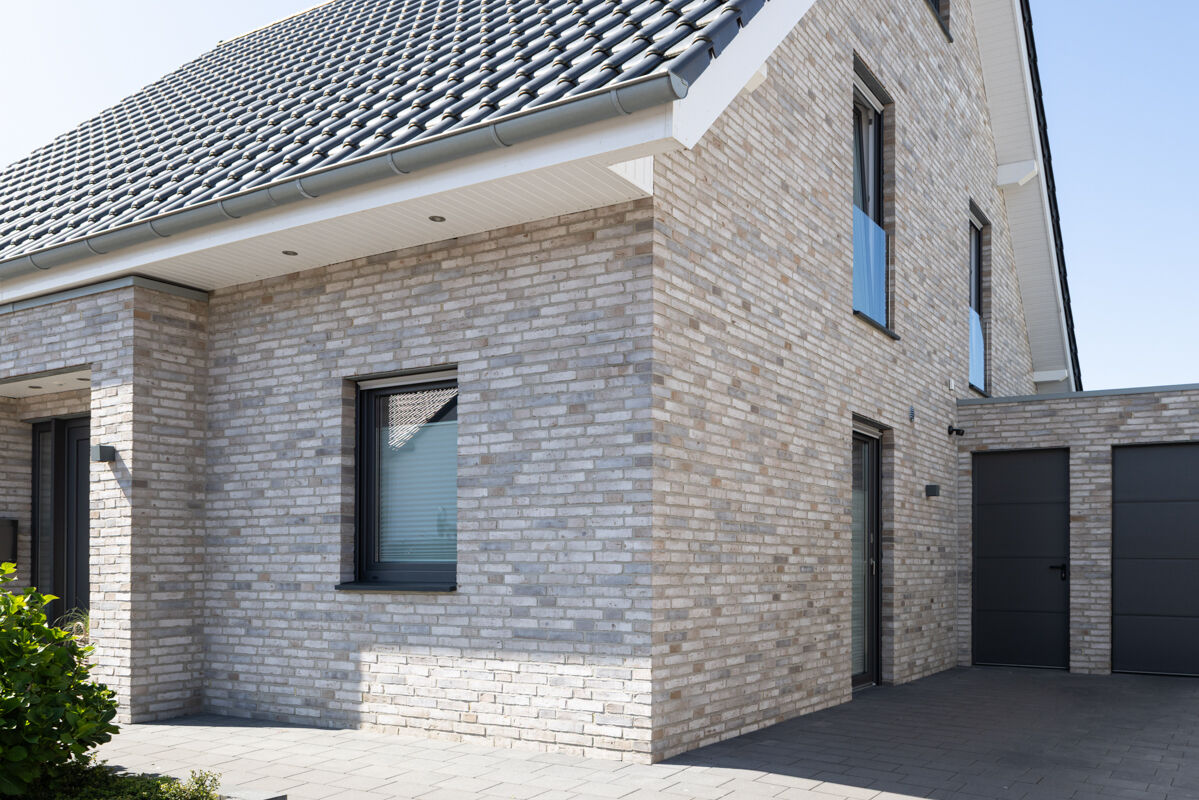 Die hier abgebildete Immobilie ist ein Einfamilienhaus 102-133-DF-H5, dessen Fassade mit dem Wasserstrich-Klinker BK-102-133-DF (Dünnformat-Klinkerstein (DF)) grau gestaltet wurde. Die verwendeten Klinker haben ein Dünnformat (DF) mit Abmessungen von 240 x 115 x 52 mm (LxBxH) und werden aus gebrannter Ton hergestellt. Die Produktion der Klinker für das Einfamilienhaus erfolgt im Wasserstrich-Verfahren. Für die Klinkerfassade des Einfamilienhauses 102-133-DF-H5 werden pro Quadratmeter Fassadenfläche 64 Klinkersteine verwendet, den dort verwendeten Klinker finden Sie hier: Zum Wasserstrich-Klinker BK-102-133-DF (Dünnformat-Klinkerstein (DF)) grau