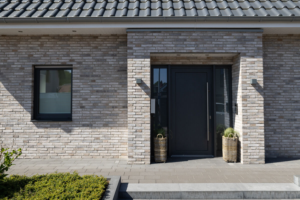 Einfamilienhäuser, insbesondere solche mit einer Klinkerfassade wie bei dem hier gezeigten Objekt mit dem Wasserstrich-Klinker BK-102-133-DF (Dünnformat-Klinkerstein (DF)) grau, sind typischerweise eher in kleineren Städten, ländlichen Regionen oder städtischem Umland zu finden. Auch im Zuge der Nachverdichtung vieler Städte gehören einzelnstehende Einfamilienhäuser weiterhin zu den favorisierten Häusertypen, wenn es um eigene Immobilien geht, denn Objekte wie das Einfamilienhaus 102-133-DF-H5 geben den Besitzern maximale Freiheit und Unabhängigkeit von der Nachbarschaft.