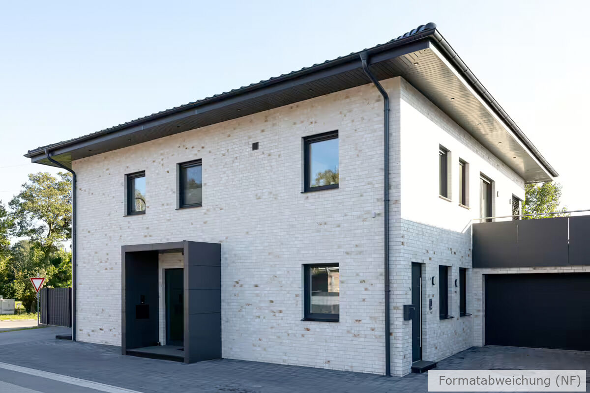 Die hier gezeigte Stadtvilla 104-153-ModF-H2 begeistert mit einer wunderbar zeitlosen Klinkerfassade, bei der der Strangpress-Klinker BK-104-153-ModF (Modulformat-Klinkerstein (ModF)) grau - weiß nunaciert vom Bauherren gewählt wurde. Die Steine werden aus gebrannter Ton produziert und ein Modulformat (ModF). Mit den Abmessungen von 290 x 115 x 52 mm (LxBxH) benötigt man 53 pro Quadratmeter Fassadenfläche. Die exakte Farbbezeichnung des verwendeten Klinkers bei der Stadtvilla 104-153-ModF-H2 ist [Klinkerfarbe], wobei durch die Produktion im Strangpress-Verfahren nicht nur die Textur und Haptik des Steins beeinflusst wird, sondern natürliche Farbnuancen der Stadtville einen ganz eigenen Charakter verleihen. Den hier genutzten Klinkersteinen finden sie hier: Zum Strangpress-Klinker BK-104-153-ModF (Modulformat-Klinkerstein (ModF)) grau - weiß nunaciert