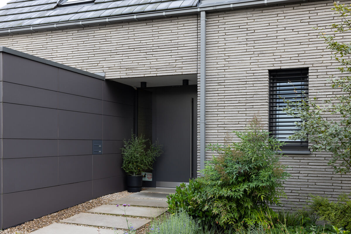 Die hier abgebildete Immobilie ist ein Einfamilienhaus 107-167-ModF-H3, dessen Fassade mit dem Wasserstrich-Klinker BK-107-167-ModF (Modulformat-Klinkerstein (ModF)) grau gestaltet wurde. Die verwendeten Klinker haben ein Modulformat (ModF) mit Abmessungen von 520 x 100 x 40 mm (LxBxH) und werden aus gebrannter Ton hergestellt. Die Produktion der Klinker für das Einfamilienhaus erfolgt im Wasserstrich-Verfahren. Für die Klinkerfassade des Einfamilienhauses 107-167-ModF-H3 werden pro Quadratmeter Fassadenfläche 39 Klinkersteine verwendet, den dort verwendeten Klinker finden Sie hier: Zum Wasserstrich-Klinker BK-107-167-ModF (Modulformat-Klinkerstein (ModF)) grau
