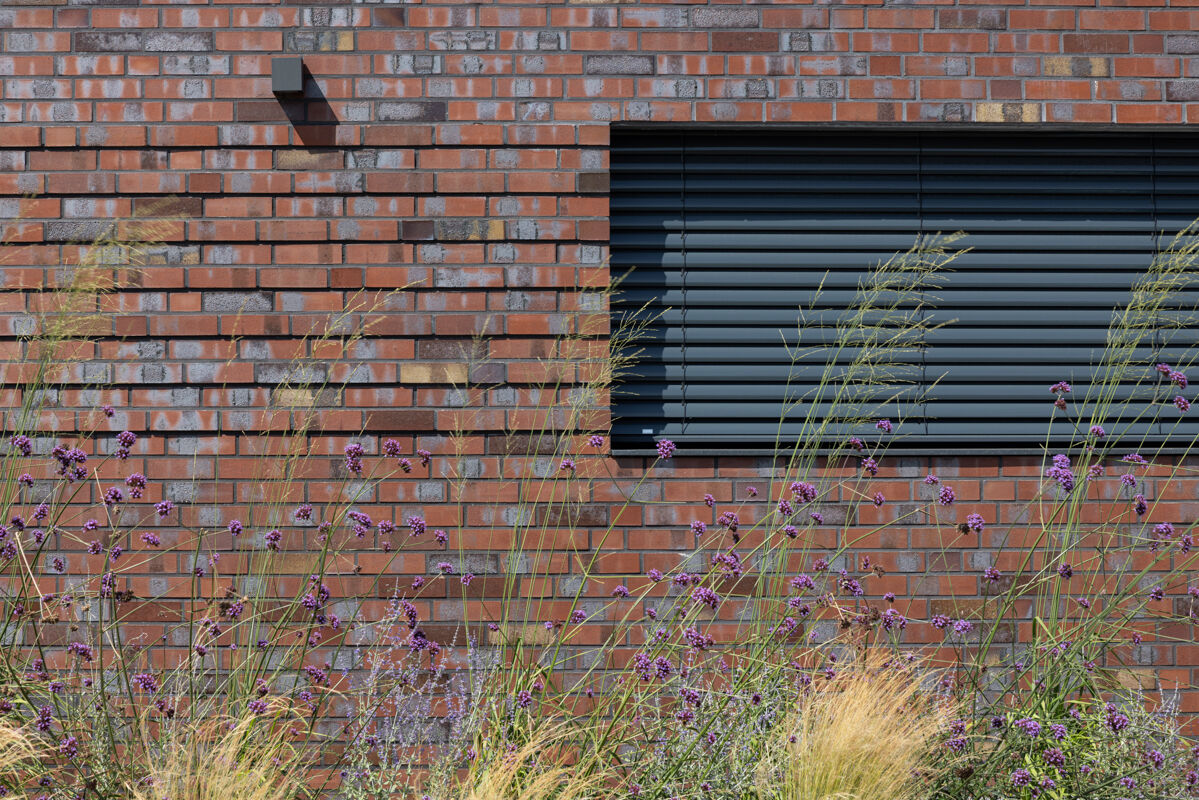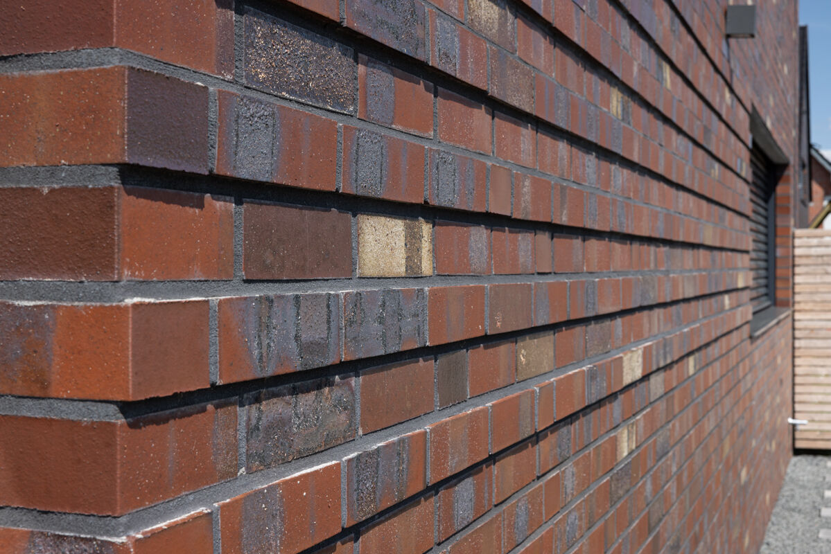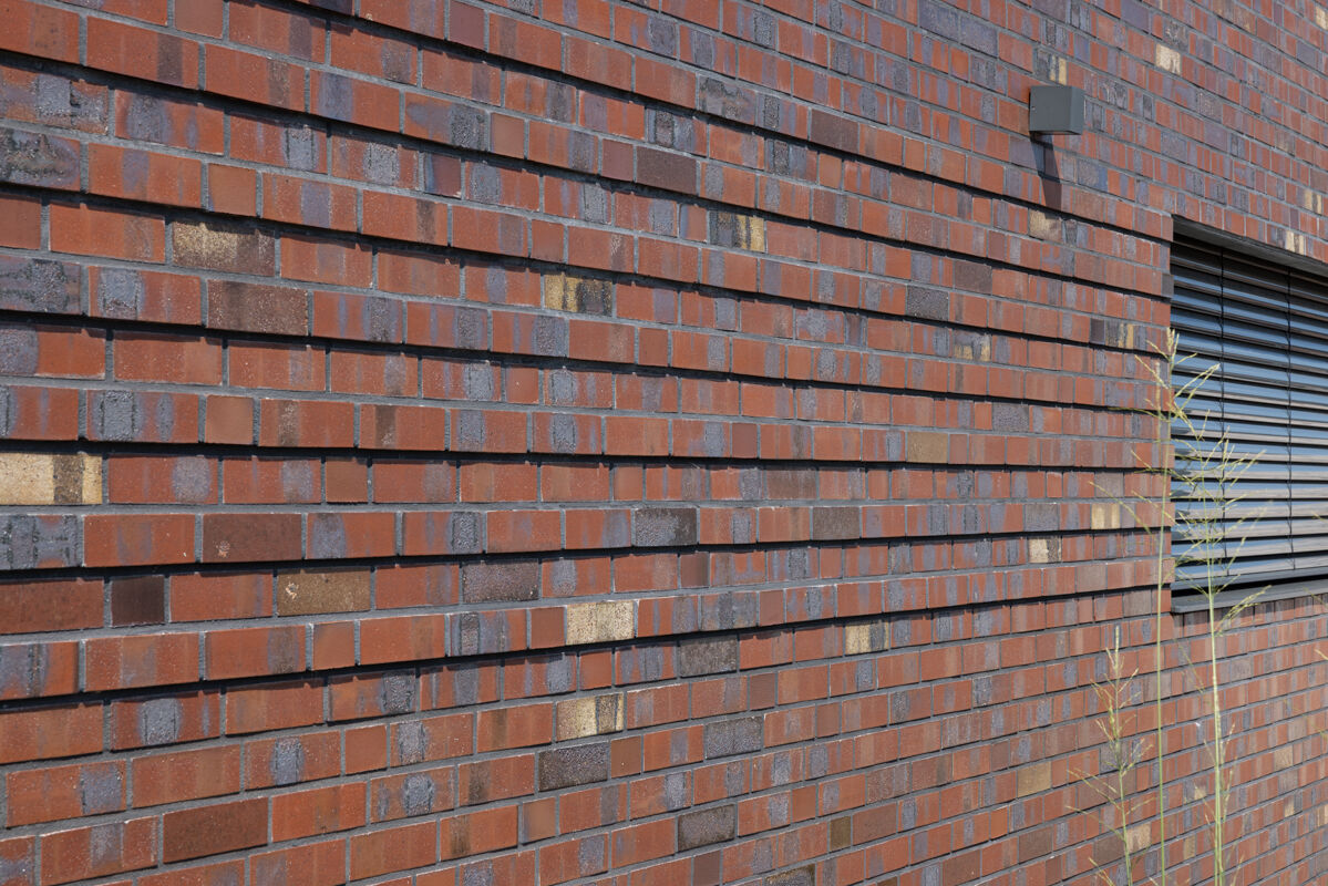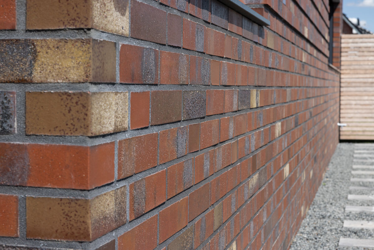 Die Wahl des passenden Klinkers für ein Einfamilienhaus erfolgt in der Regel nach drei Kriterien: Welche Farbe soll der Klinker haben, welches Klinkerformat sollen die Steine haben und nach welchem Herstellungsverfahren werden die Steine produziert. In diesem Fall haben sich die Besitzer des Einfamilienhauses 108-119-NF-H15 für einen Klinkerstein im Normalformat (NF) entschieden, so dass die einzelnen Steine mit den Maßen 240 x 115 x 71 mm (LxBxH) verbaut werden. In Kombination mit dem Strangpress-Verfahren und der Farbe rot-bunt verleiht dieser Klinker dem Einfamilienhaus eine ganz charakteristische Optik und einen individuellen Charakter.