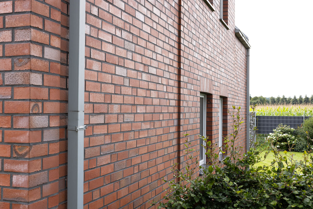 Die Wahl des passenden Klinkers für ein Einfamilienhaus erfolgt in der Regel nach drei Kriterien: Welche Farbe soll der Klinker haben, welches Klinkerformat sollen die Steine haben und nach welchem Herstellungsverfahren werden die Steine produziert. In diesem Fall haben sich die Besitzer des Einfamilienhauses 108-184-NF-H8 für einen Klinkerstein im Normalformat (NF) entschieden, so dass die einzelnen Steine mit den Maßen 240 x 115 x 71 mm (LxBxH) verbaut werden. In Kombination mit dem Strangpress-Verfahren und der Farbe rot-blau-bunt verleiht dieser Klinker dem Einfamilienhaus eine ganz charakteristische Optik und einen individuellen Charakter.