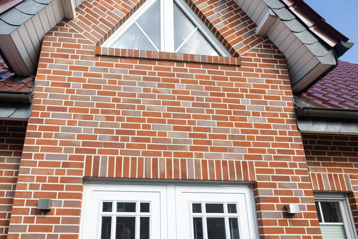 Die Wahl des passenden Klinkers für ein Einfamilienhaus erfolgt in der Regel nach drei Kriterien: Welche Farbe soll der Klinker haben, welches Klinkerformat sollen die Steine haben und nach welchem Herstellungsverfahren werden die Steine produziert. In diesem Fall haben sich die Besitzer des Einfamilienhauses 108-206-NF-H2 für einen Klinkerstein im Normalformat (NF) entschieden, so dass die einzelnen Steine mit den Maßen 240 x 115 x 71 mm (LxBxH) verbaut werden. In Kombination mit dem Strangpress-Verfahren und der Farbe rot blau bunt verleiht dieser Klinker dem Einfamilienhaus eine ganz charakteristische Optik und einen individuellen Charakter.