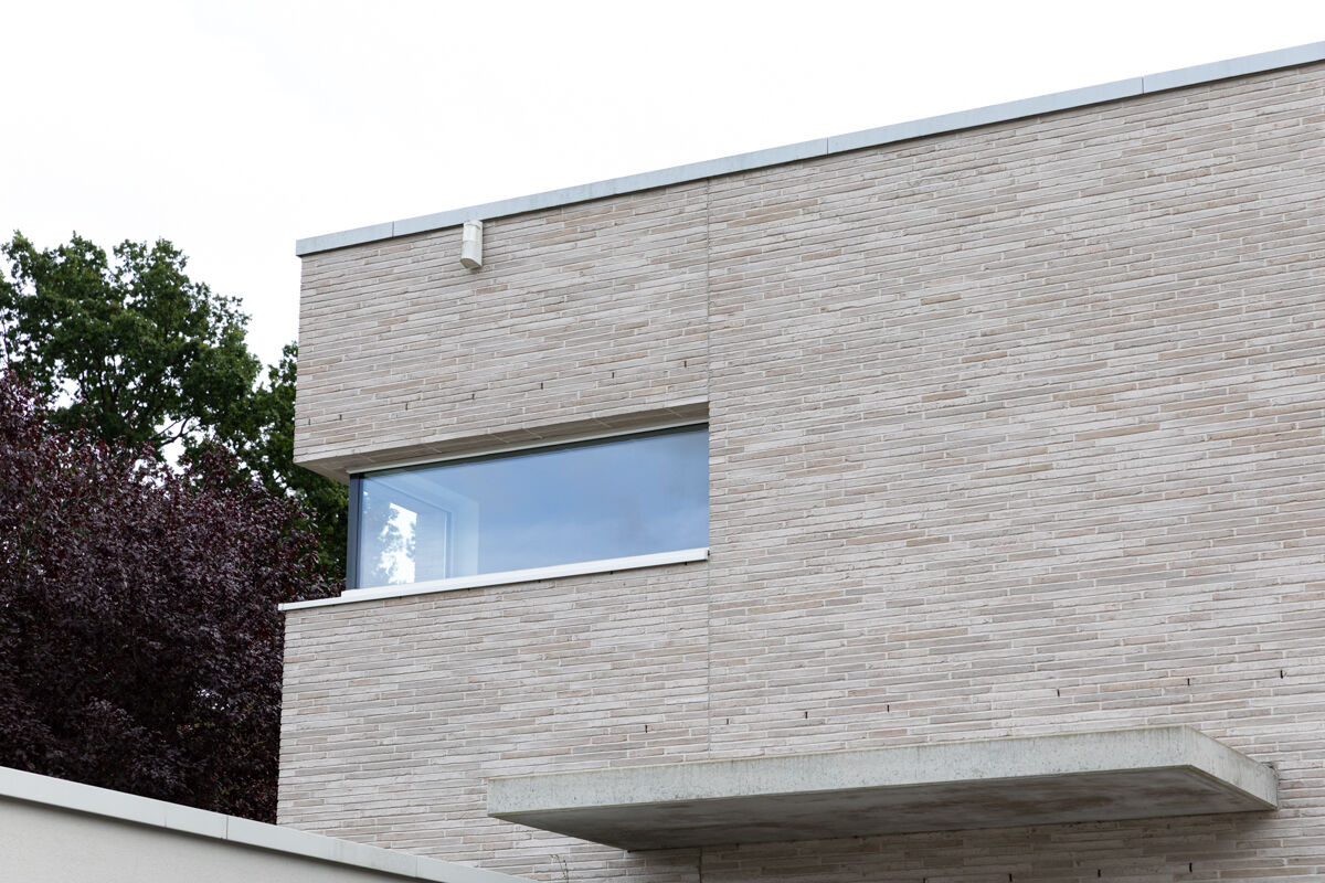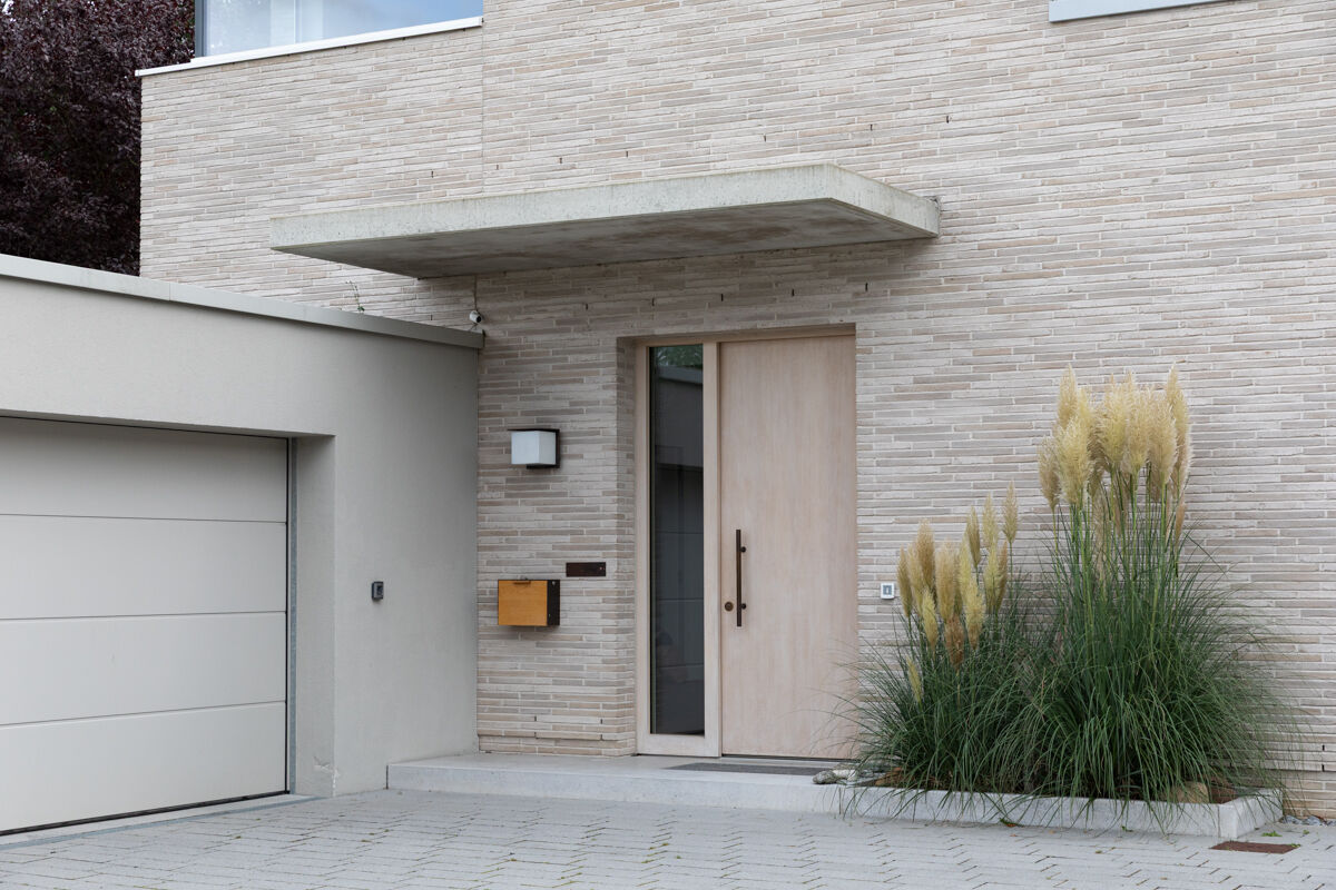 Für das hier präsentierte moderne Luxushaus 122-105-ModF-H13 haben sich die Bauherren für eine Variante im Modulformat (ModF) entschieden, so dass die Klinker Maße von 468 x 108 x 38 mm (LxBxH) haben. In Kombination mit dem Wasserstrich-Verfahren und der Farbe beige, sand nuanciert entsteht dann für das Luxushaus eine ganz eigene Anmutung der Klinkerfassade, die die Architektur unterstützt und Akzente setzt.