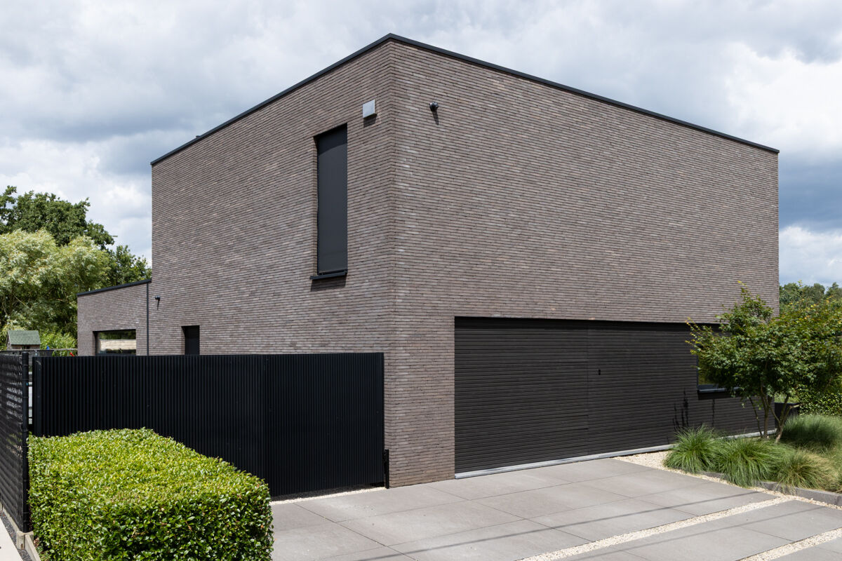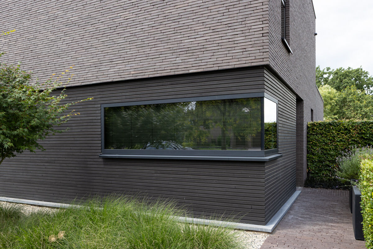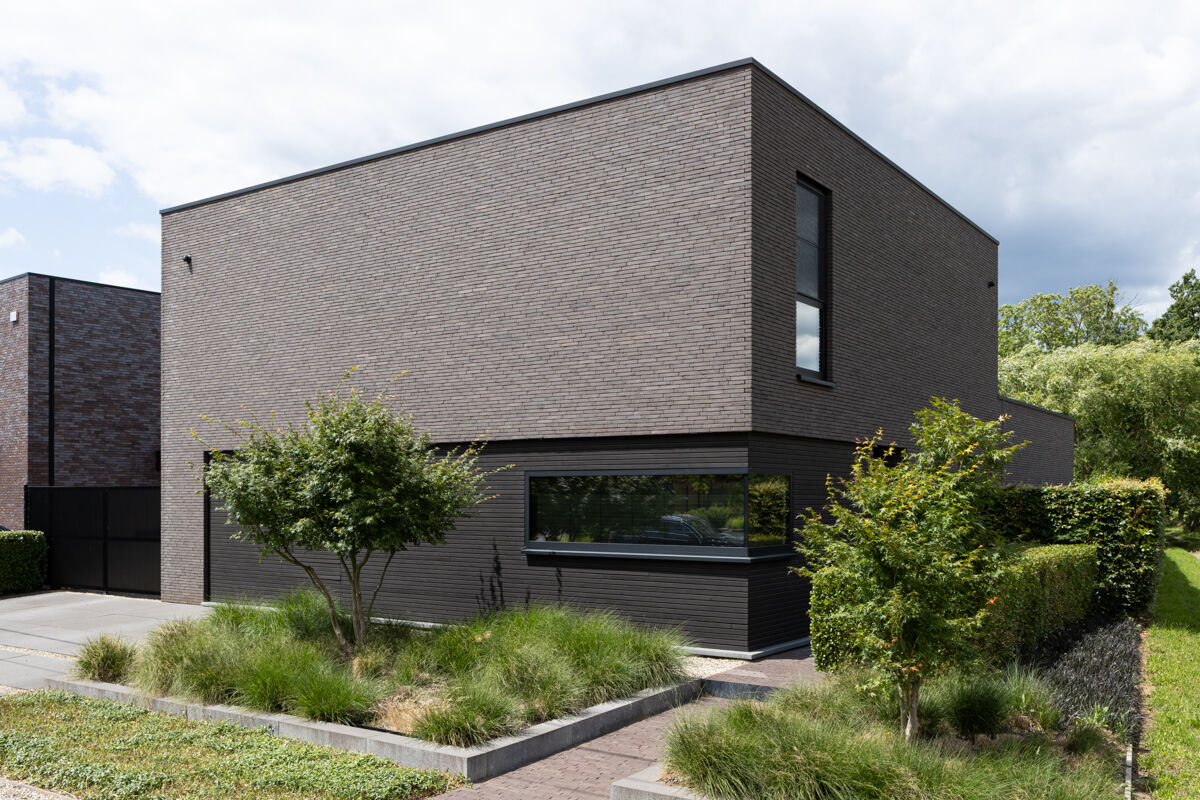 Für das hier präsentierte moderne Luxushaus 128-125-ModF-H4 haben sich die Bauherren für eine Variante im Modulformat (ModF) entschieden, so dass die Klinker Maße von 240 x 73 x 38 mm (LxBxH) haben. In Kombination mit dem Handform-Verfahren und der Farbe dunkelrot bunt entsteht dann für das Luxushaus eine ganz eigene Anmutung der Klinkerfassade, die die Architektur unterstützt und Akzente setzt.