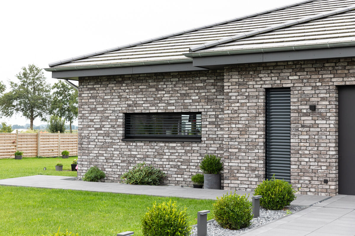 In diesem Fall haben sich die Bauherren bei der Planung des Bungalows 113-119-NF-H3 für einen Klinkerstein im Normalformat (NF) entschieden, so dass die einzelnen Steine mit den Maßen 240 x 115 x 71 mm (LxBxH) verbaut werden. In Kombination mit dem Handform-Verfahren und der Farbe grau - bunt verleiht dieser Klinker dem Bungalow eine charakterstarke und zeitlos elegante Optik.