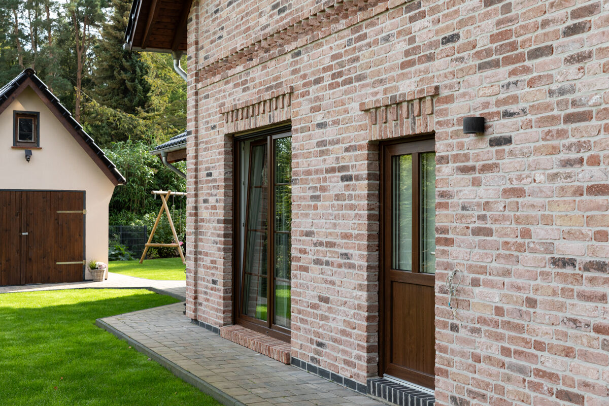 Die Wahl des passenden Klinkers für ein Einfamilienhaus erfolgt in der Regel nach drei Kriterien: Welche Farbe soll der Klinker haben, welches Klinkerformat sollen die Steine haben und nach welchem Herstellungsverfahren werden die Steine produziert. In diesem Fall haben sich die Besitzer des Einfamilienhauses 113-137-NF-H4 für einen Klinkerstein im Normalformat (NF) entschieden, so dass die einzelnen Steine mit den Maßen 240 x 115 x 71 mm (LxBxH) verbaut werden. In Kombination mit dem Handform-Verfahren und der Farbe rot - bunt verleiht dieser Klinker dem Einfamilienhaus eine ganz charakteristische Optik und einen individuellen Charakter.