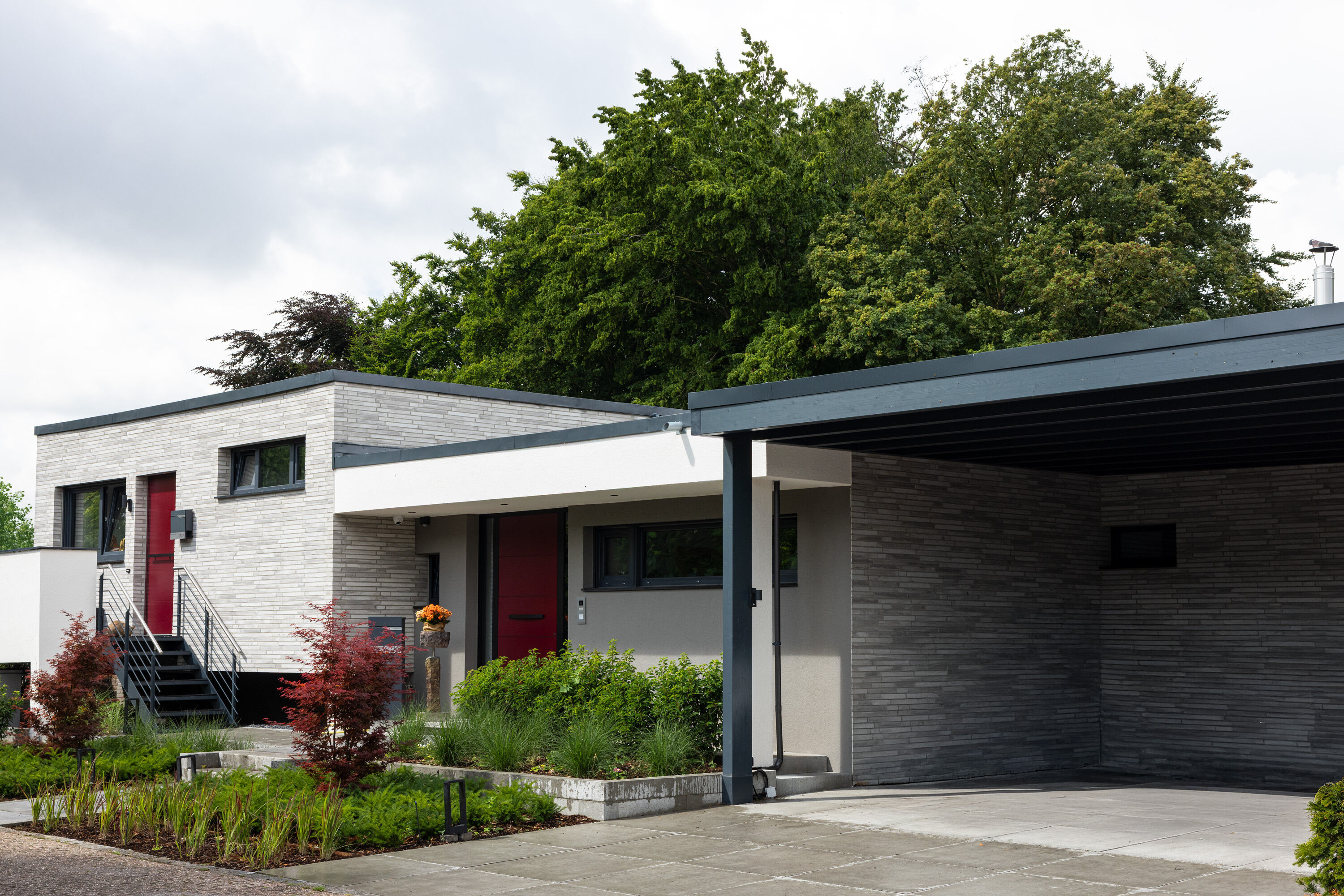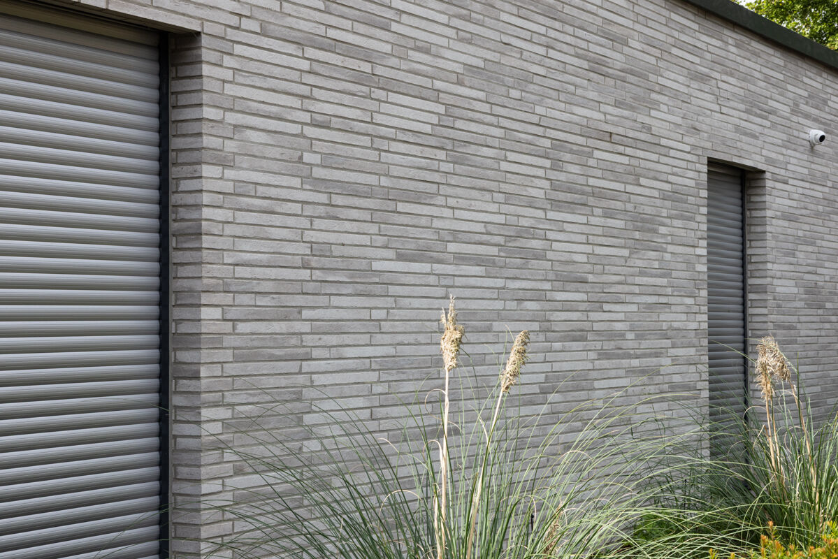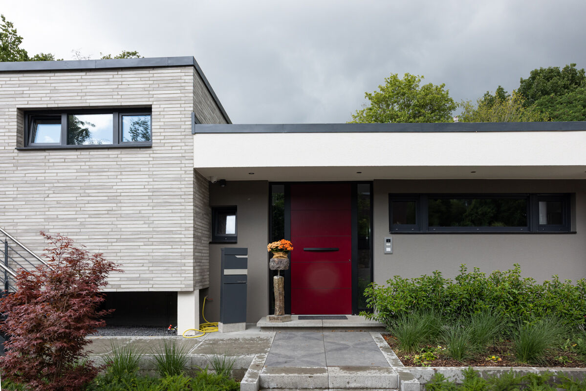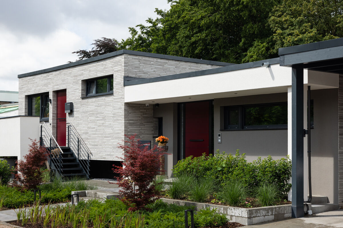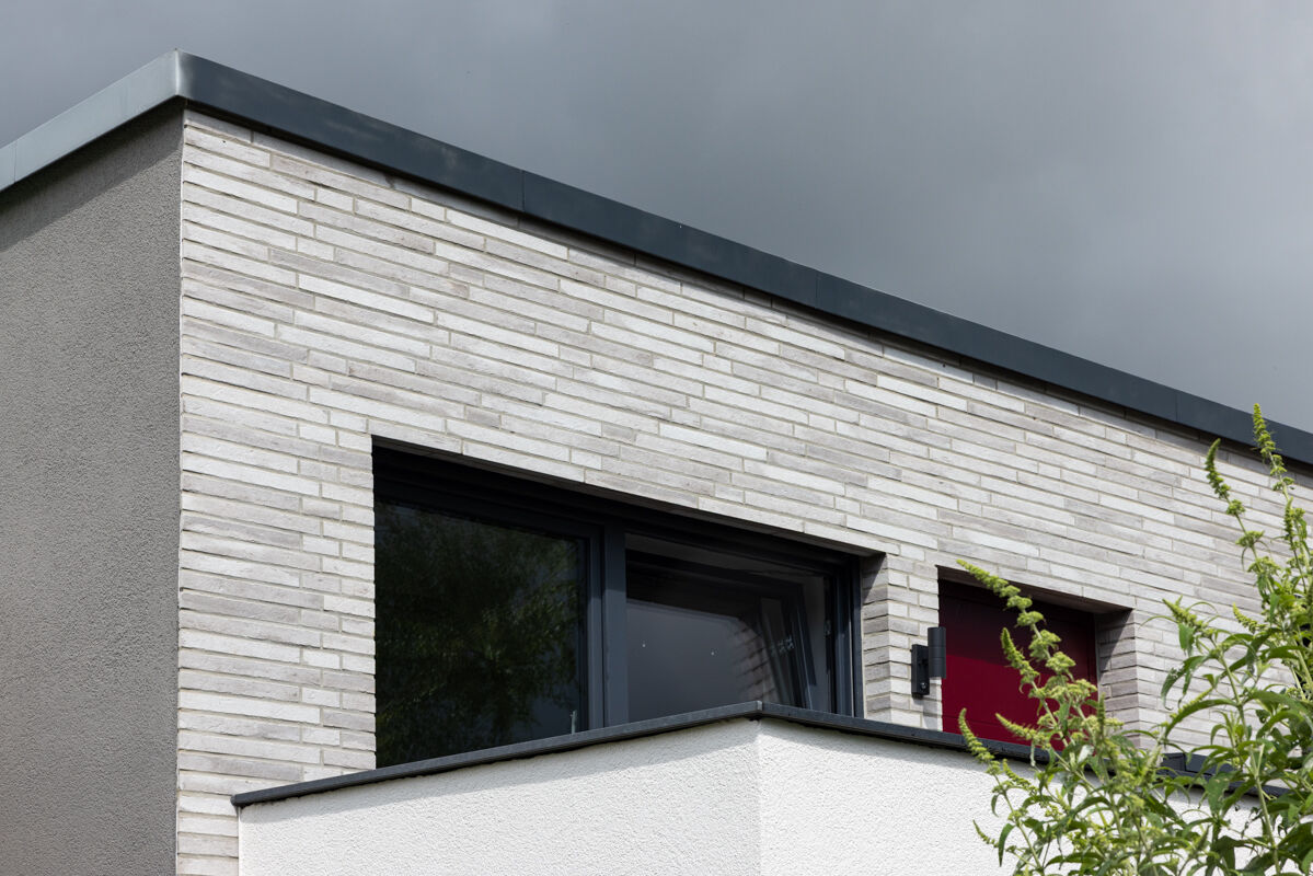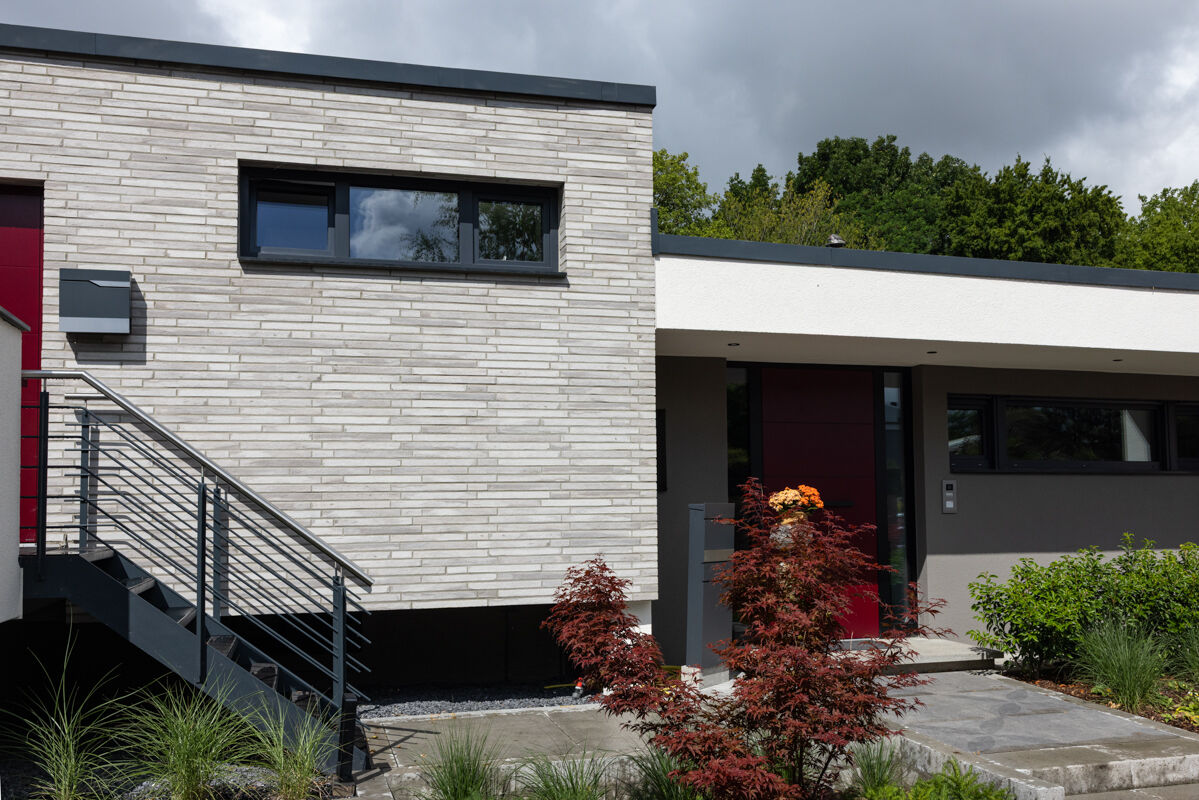 In diesem Fall haben sich die Bauherren bei der Planung des Bungalows R-129-117-ModF-H1 für einen Klinkerstein im Modulformat (ModF) entschieden, so dass die einzelnen Steine mit den Maßen 468 x 10 x 40 mm (LxBxH) verbaut werden. In Kombination mit dem Strangpress-Verfahren und der Farbe grau weiß bunt verleiht dieser Klinker dem Bungalow eine charakterstarke und zeitlos elegante Optik.
